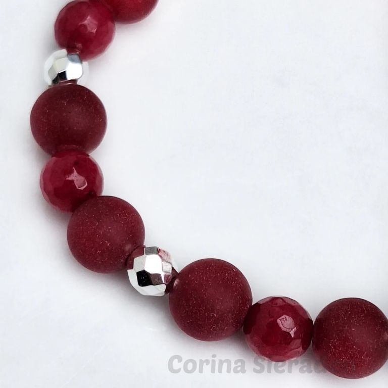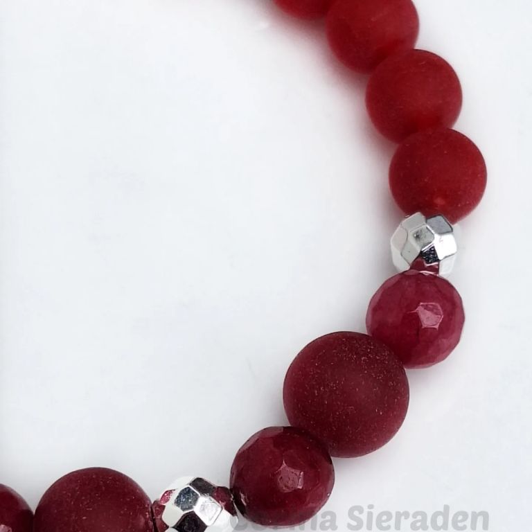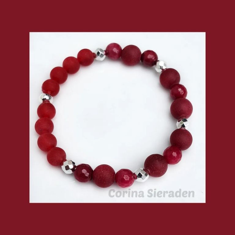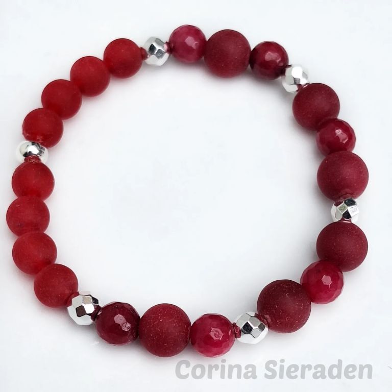 Leuke armband van rode chalcedoon (8 en 10 mm mat en 8 mm facetgeslepen) en hematiet, geregen op elastiek.