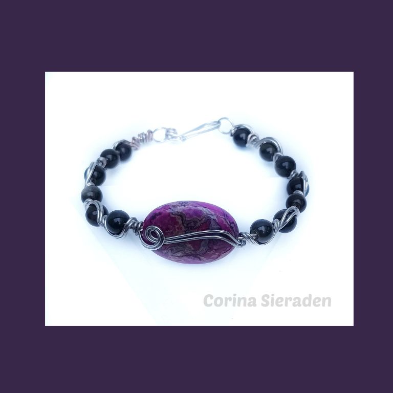 Elegante, wire wrapped armband met golden obsidiaan en sierkraal van agaat, gewikkeld in vertind koper.