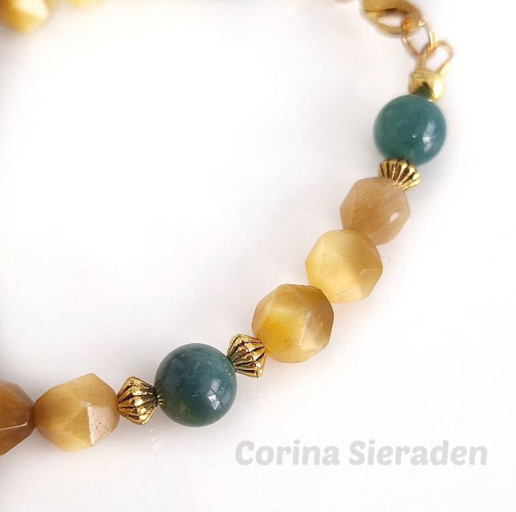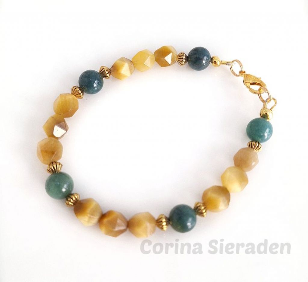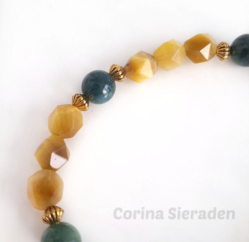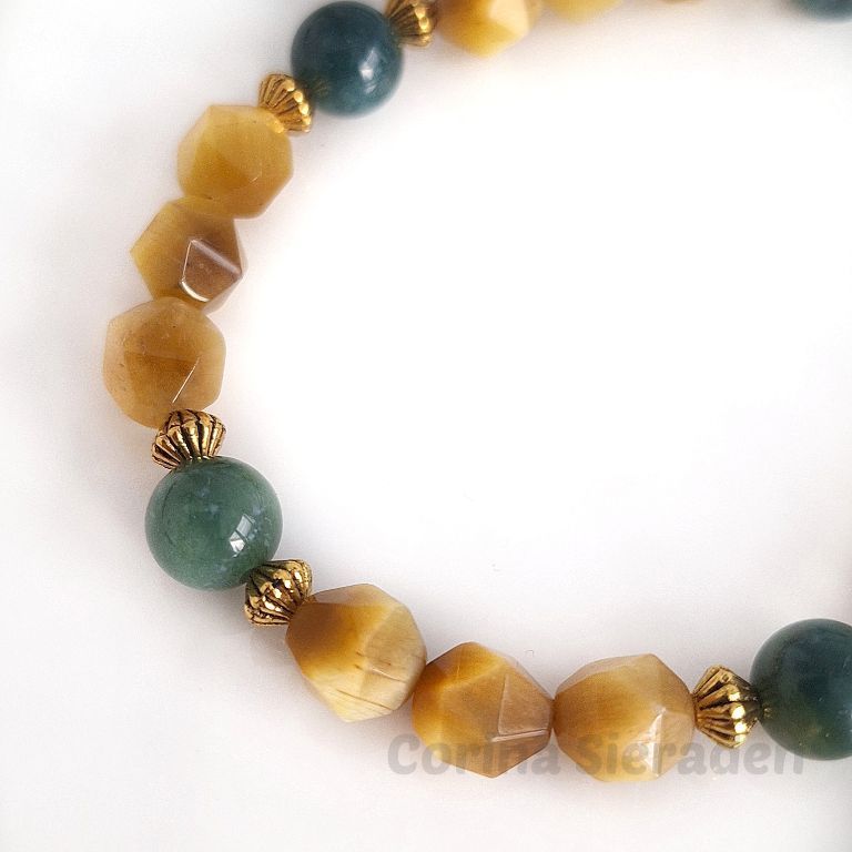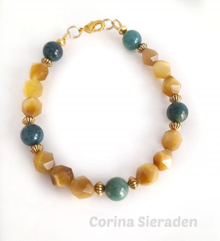 Deze unieke armband heb ik gemaakt van facetgeslepen golden tiger eye (8 mm) en mosagaat (8 mm), met goudkleurige spacers.