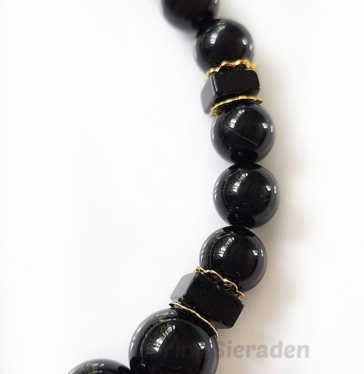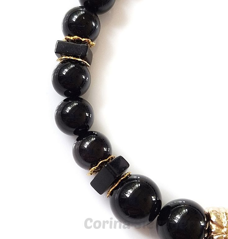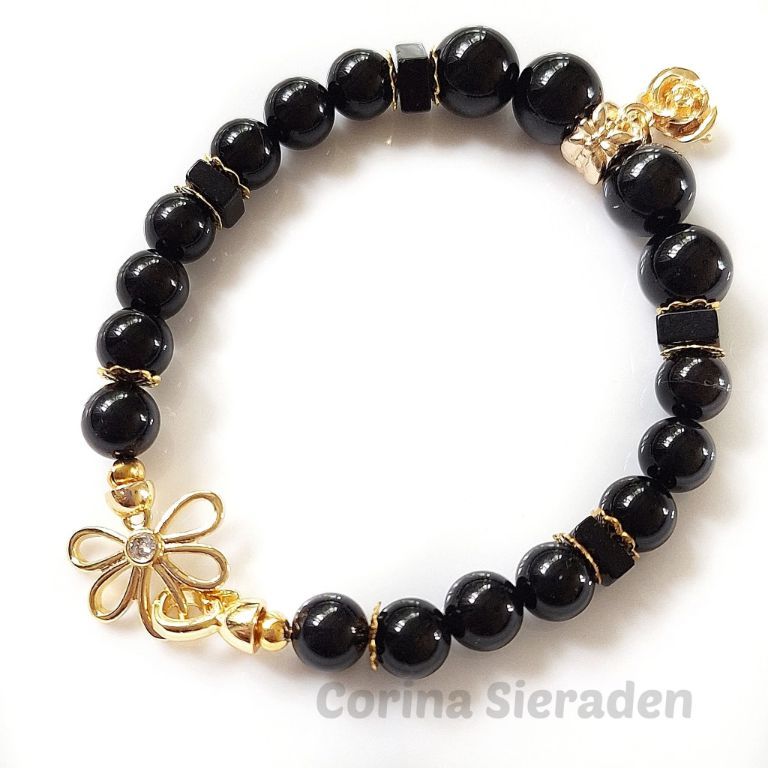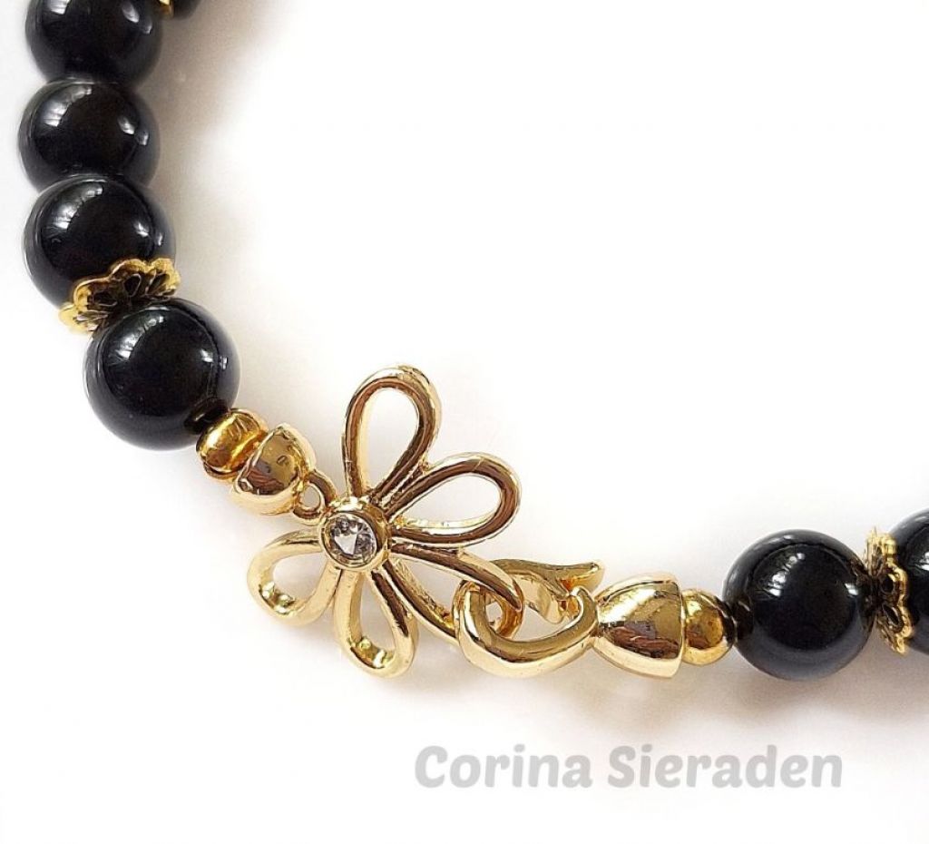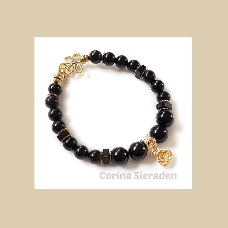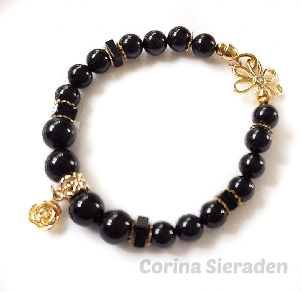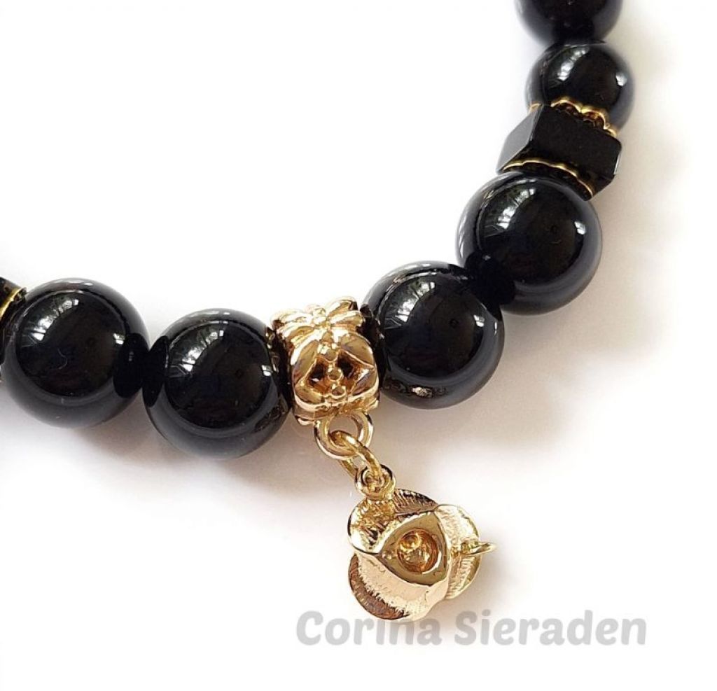Armband van black agaat (8 en 10 mm, vierkant 6x2 mm) en messing kralenkapjes, met messing bedel roos en verguld sierslotje met strass steentje.