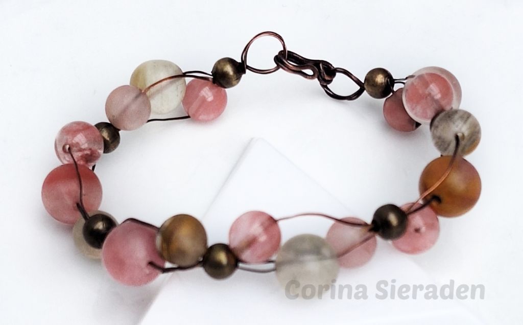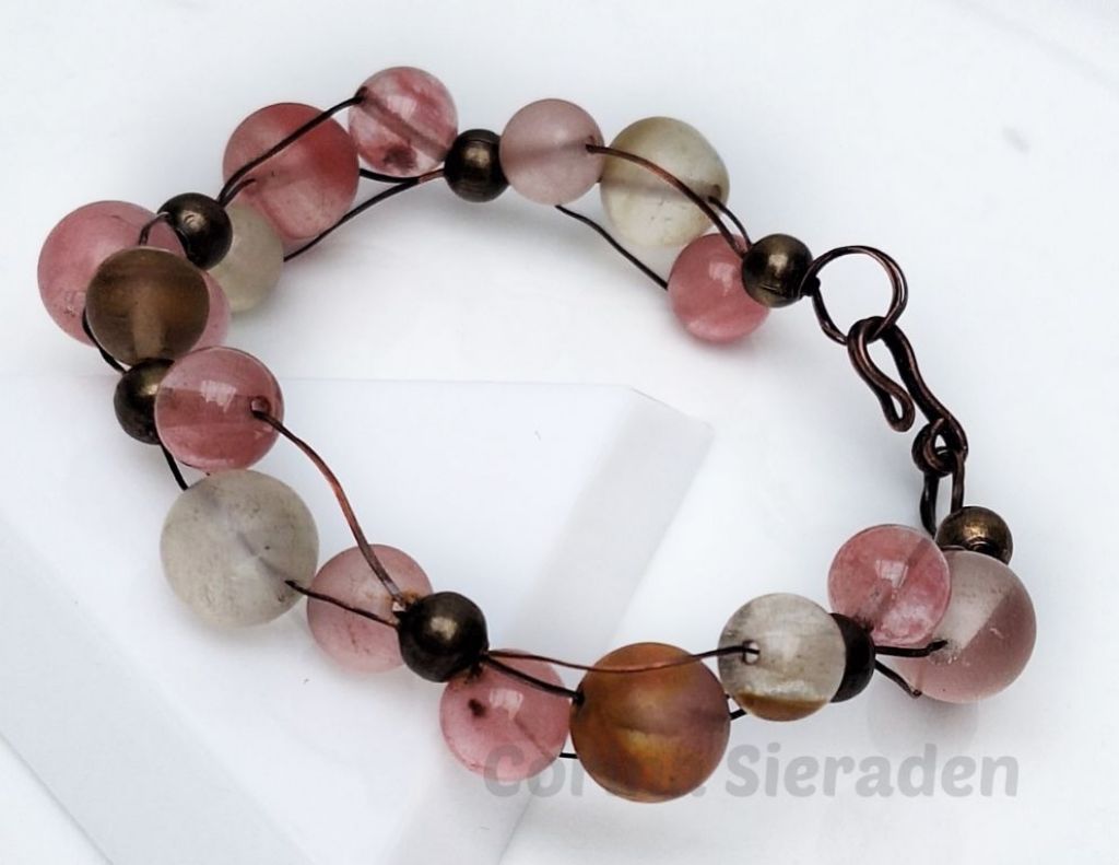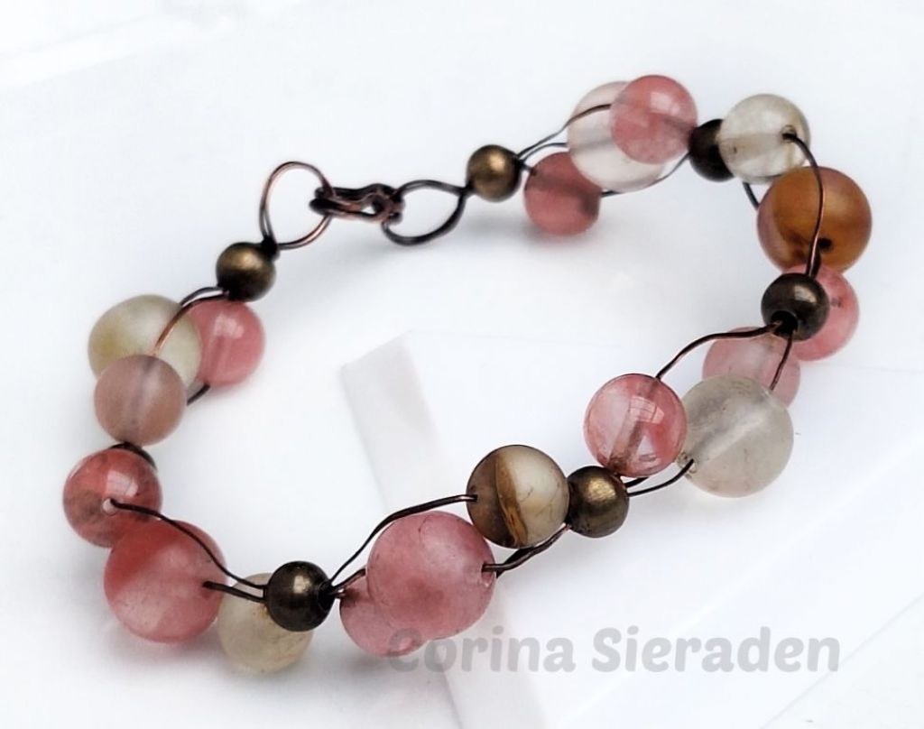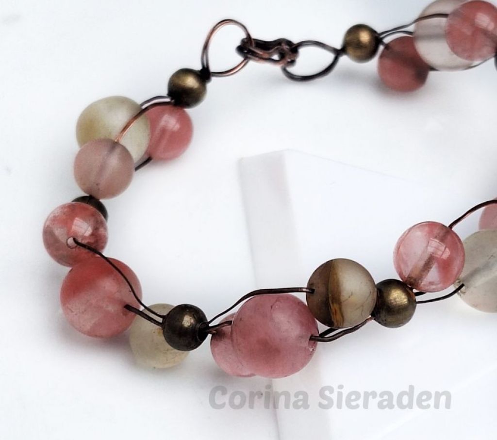 Wire wrapped armband van watermeloen quartz (8 en 10 mm, glad en frosted) in geoxideerd koperdraad.