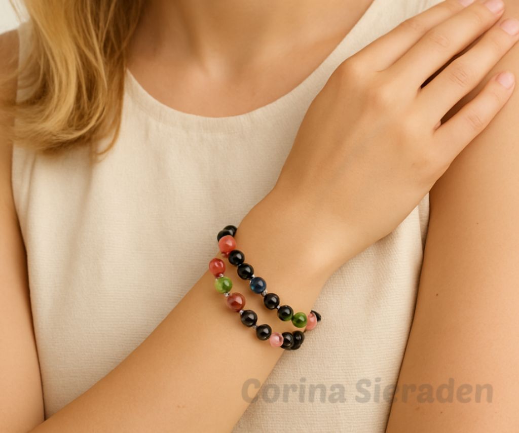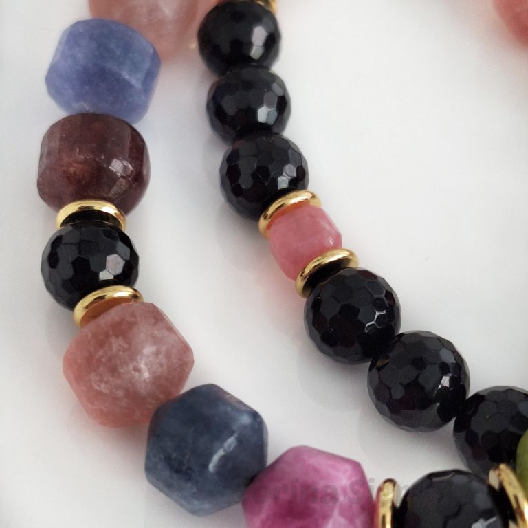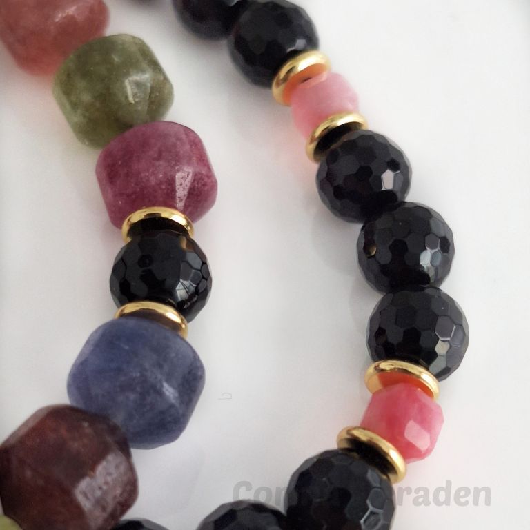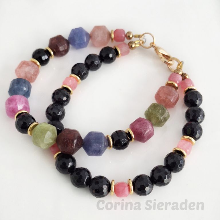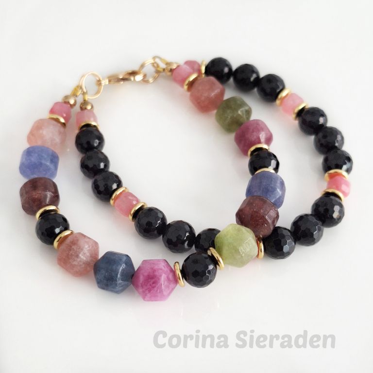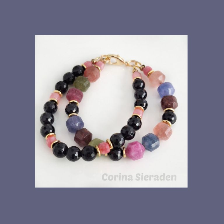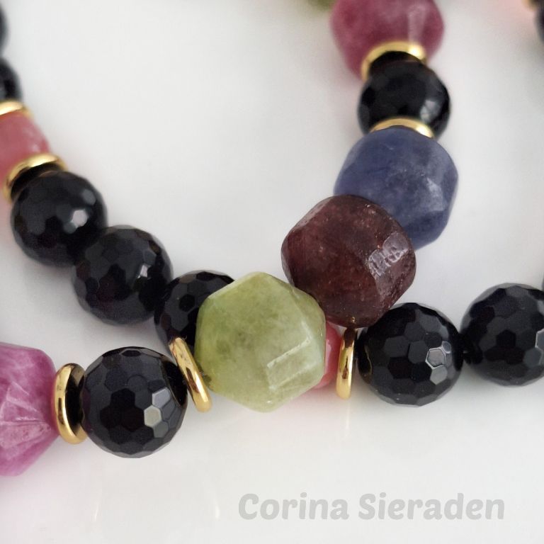 Dubbele armband van kleurrijke facetgeslepen toermalijn (5 en 10 mm), zwarte facetgeslepen toermalijn (8 mm) en messing spacers.