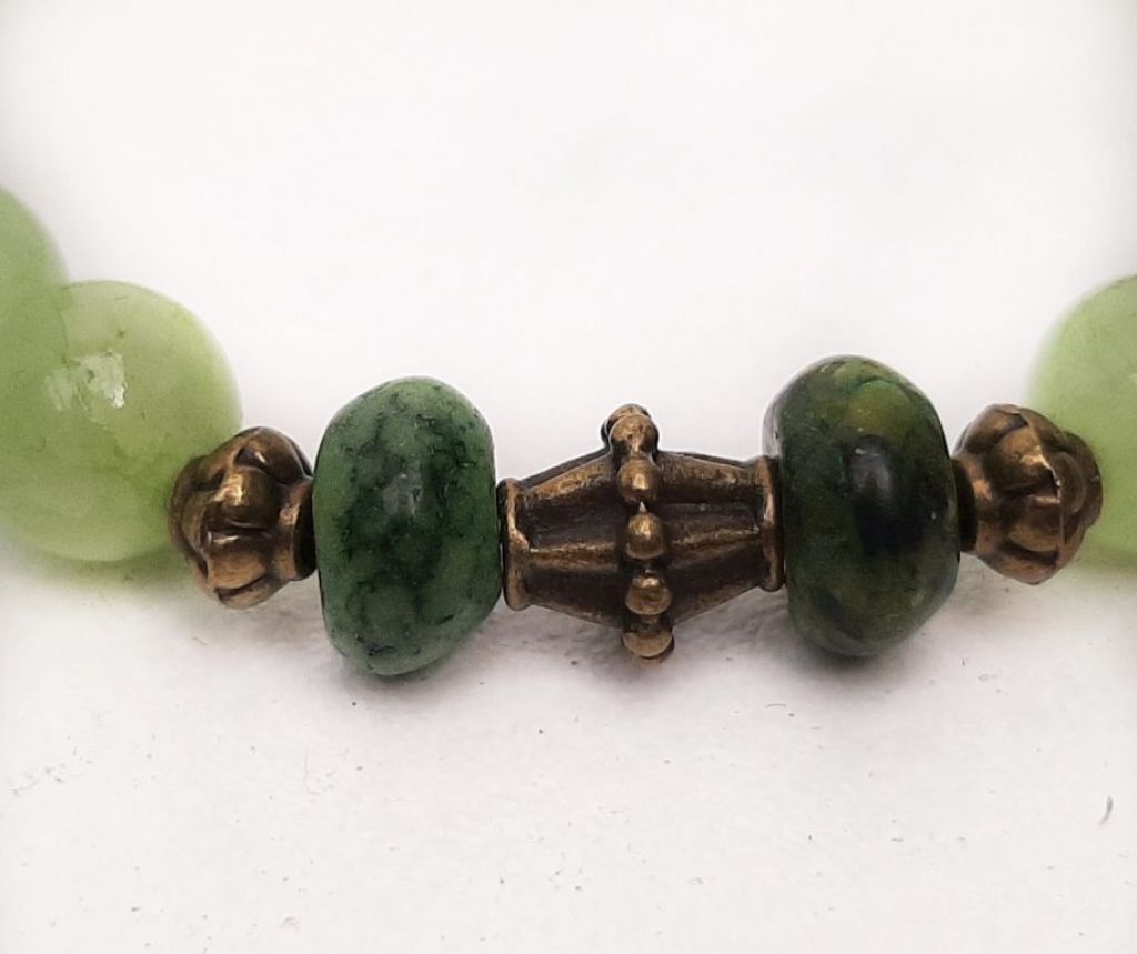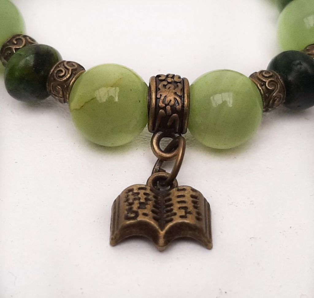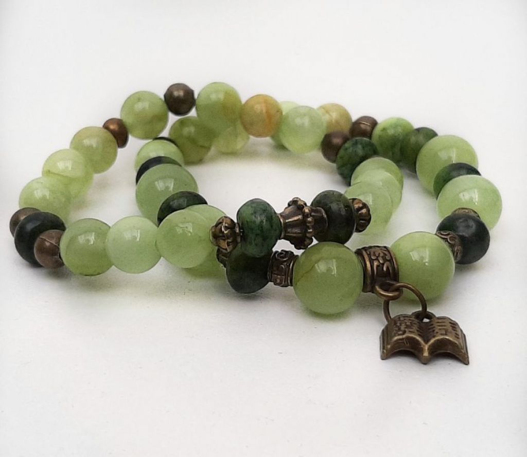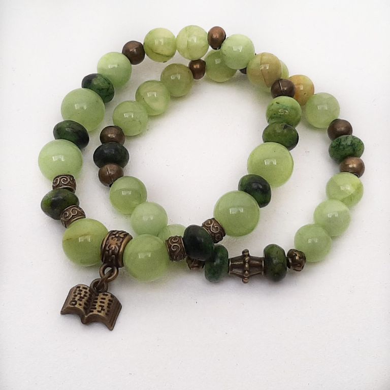 Armbandenset (2-delig) van chalcedoon (8 en 10 mm), serpentijn rondel en brons, met bedel boek, geregen op elastiek.
