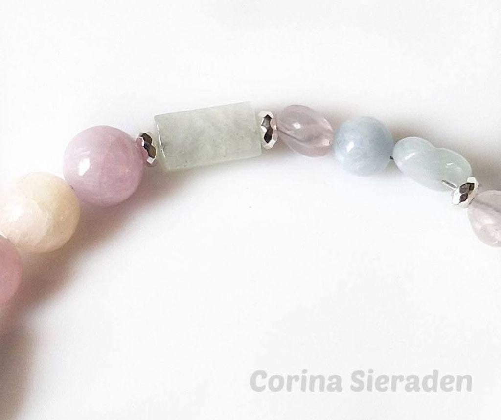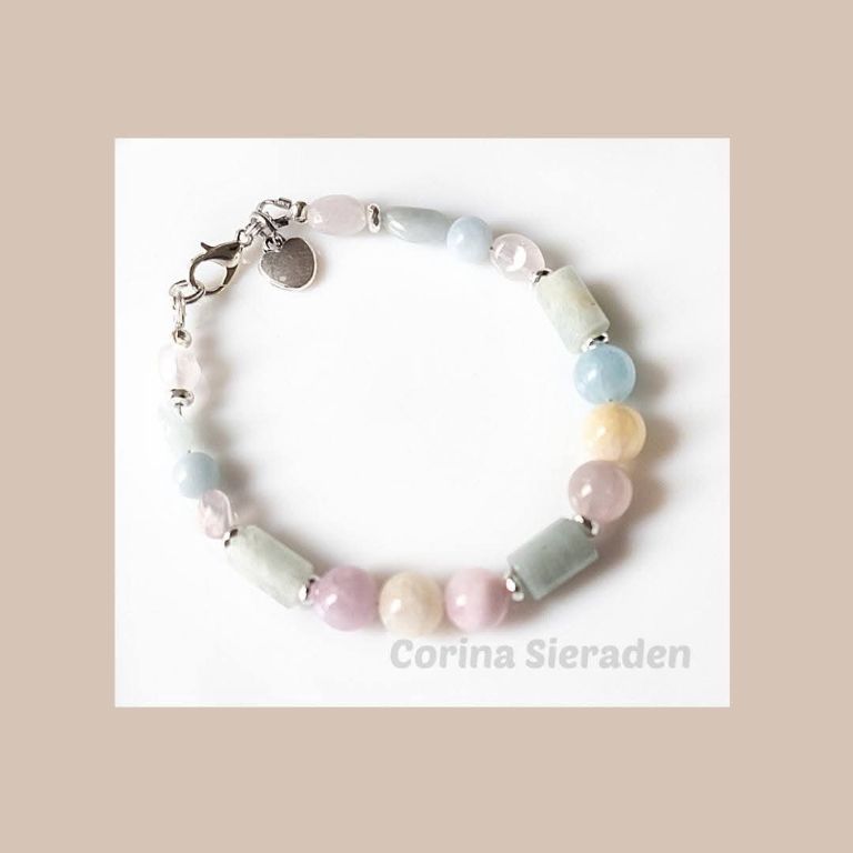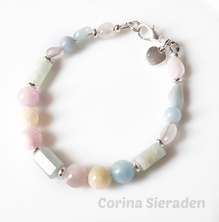 Deze schattige armband is gemaakt van morganiet (facetgeslepen cilinder, onregelmatig, 6 en 8 mm rond), hematiet spacers en is afgewerkt met bedel hartje.