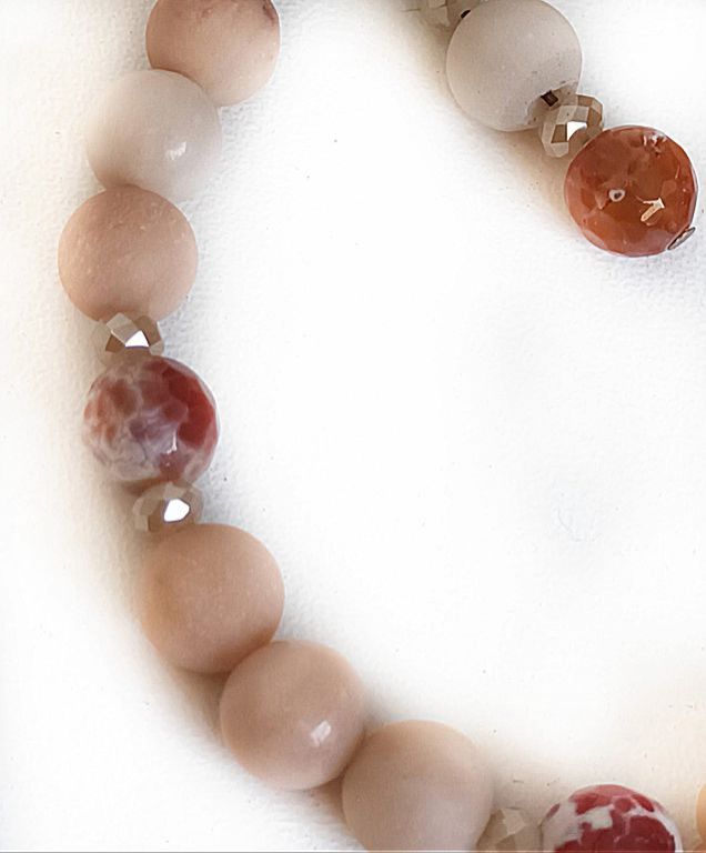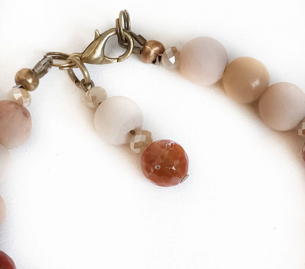 Armband van aventurijn (8 mm glad en mat), crackle agaat en kristallen facetkraaltjes, met een sierkraal (bloem) van jade, bedel van kralen en slotje van brons.