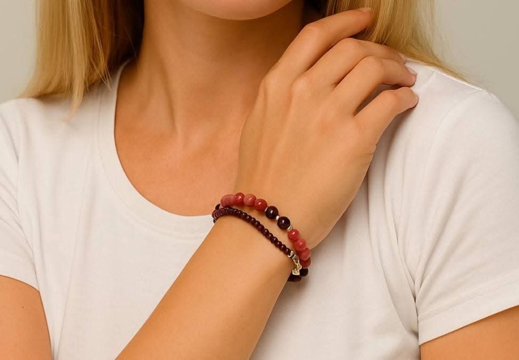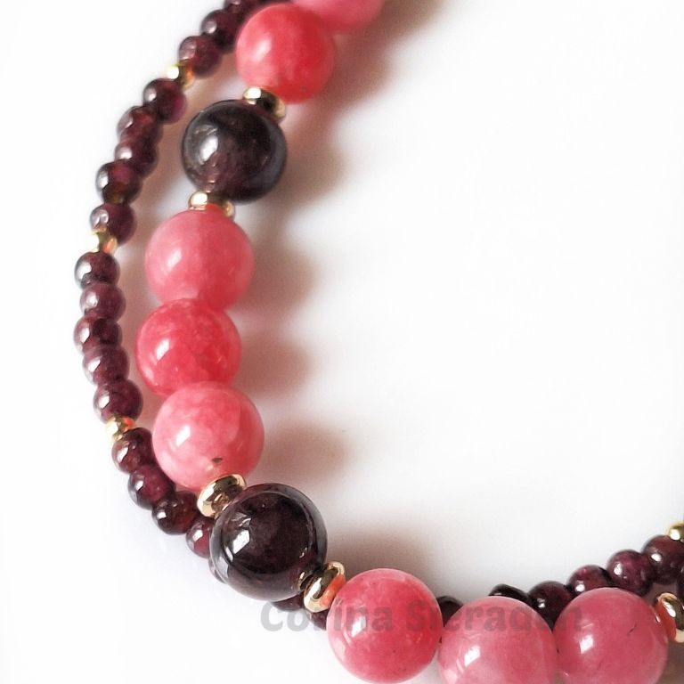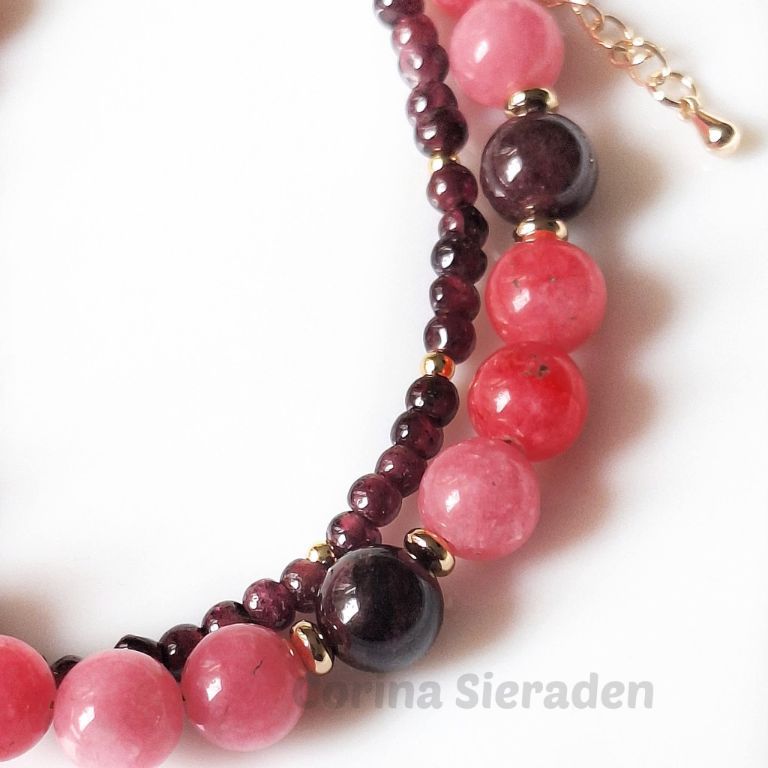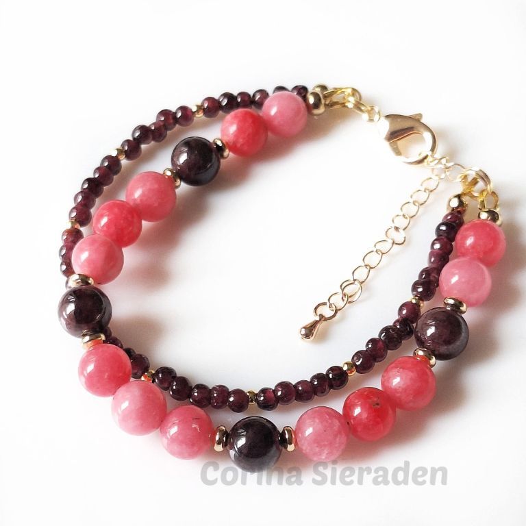 Dubbele armband van angeliet (8 mm), granaat (8 en 2 mm) en messing spacers, afgewerkt met een verlengkettinkje.
