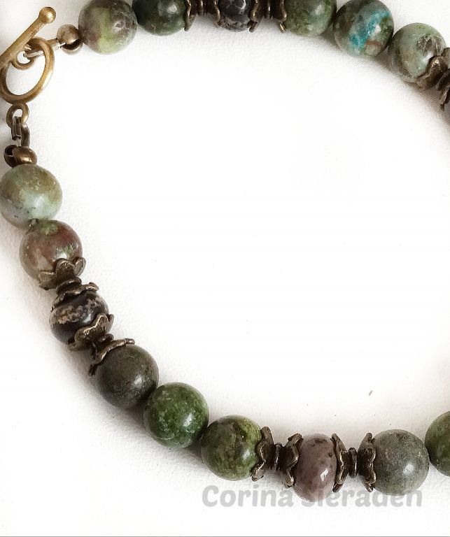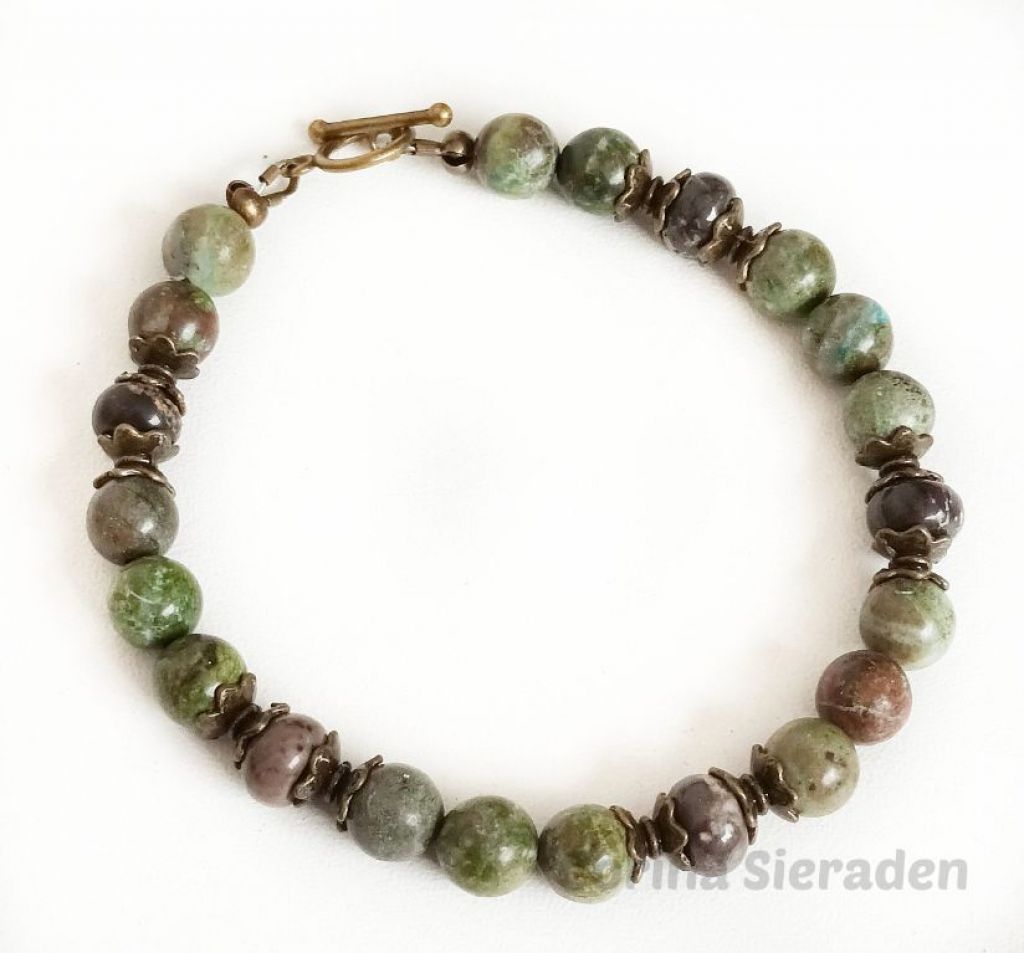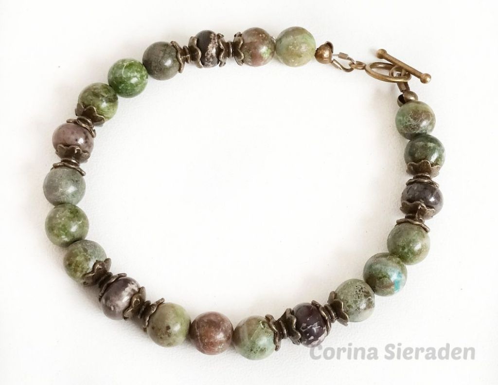 CORINA SIERADEN Bij welke uilen liefhebster kom ik om haar pols? Armband van cherry blossem jaspis, crazy agaat en brons, met sierkraal uil, geregen op elastiek. Polsmaat: 19 cm.