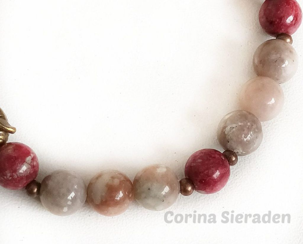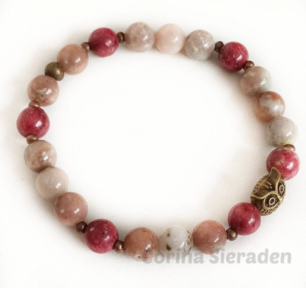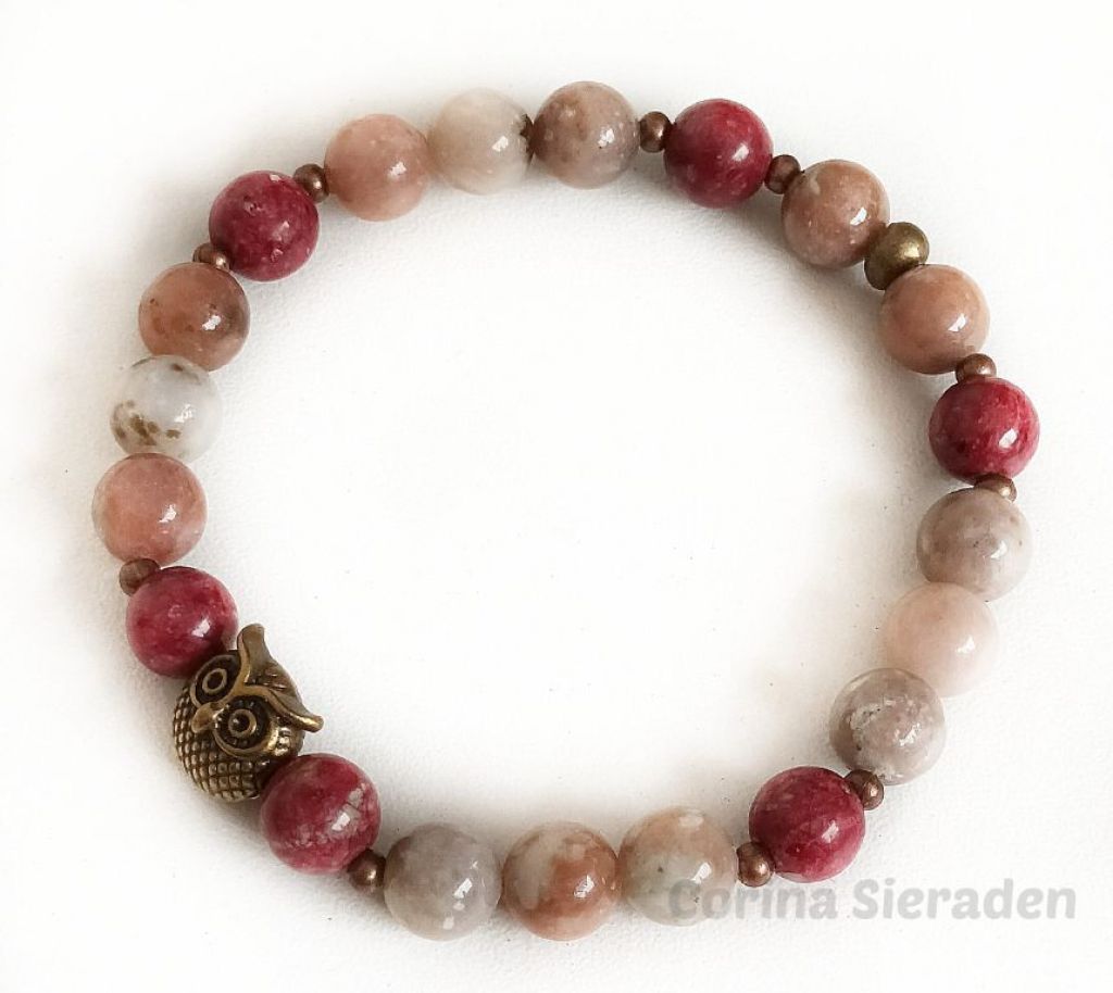 Armband van cherry blossem jaspis, crazy agaat en brons, met sierkraal uil, geregen op elastiek.