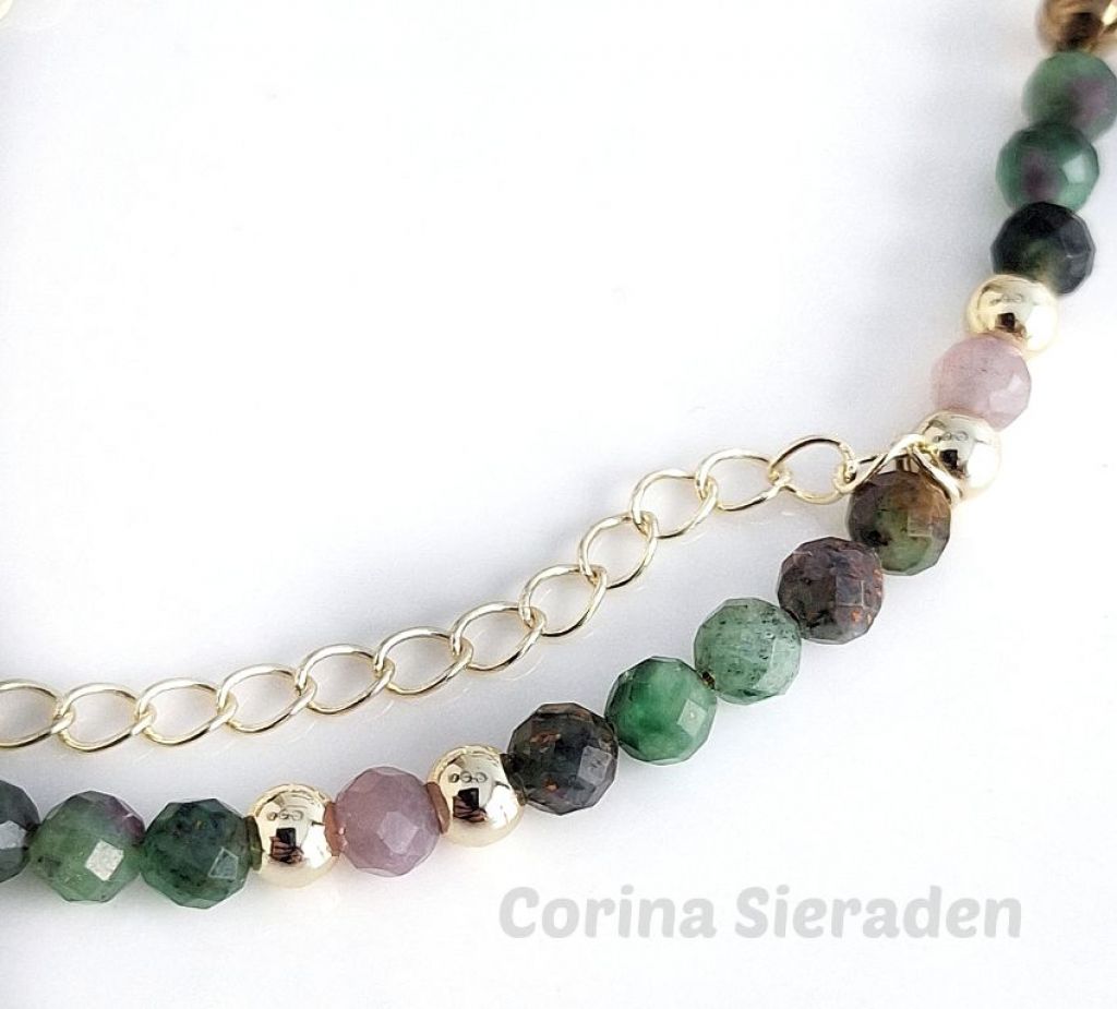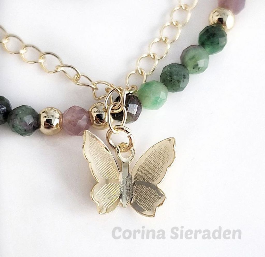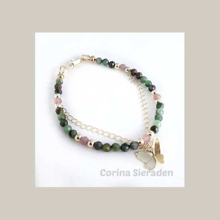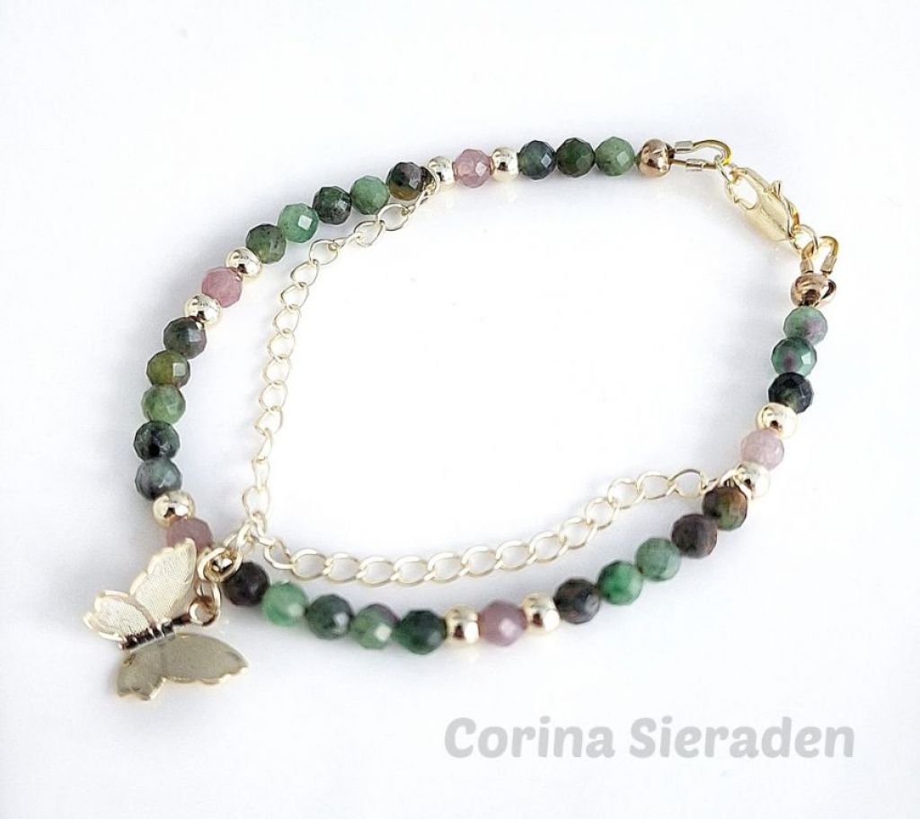 Unieke armband van ruby zoisiet (4 mm facetgeslepen), rosequartz (4 mm facetgeslepen) en GOLDPLATED spacers, met goldplated bedel vlinder aan evenzo goldplated jasseron.