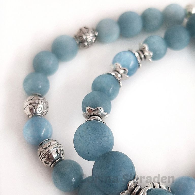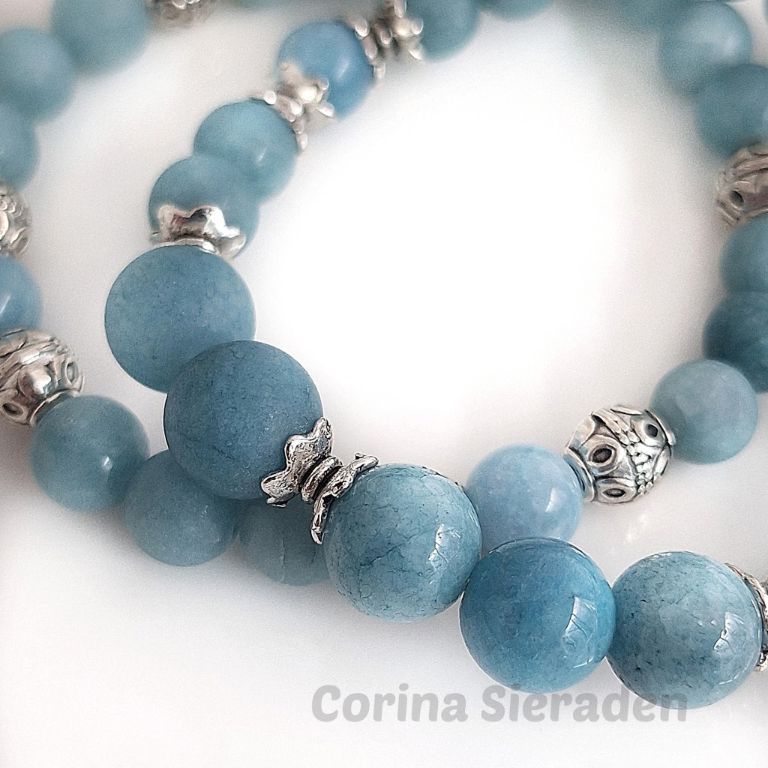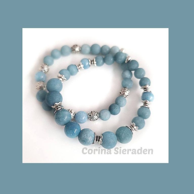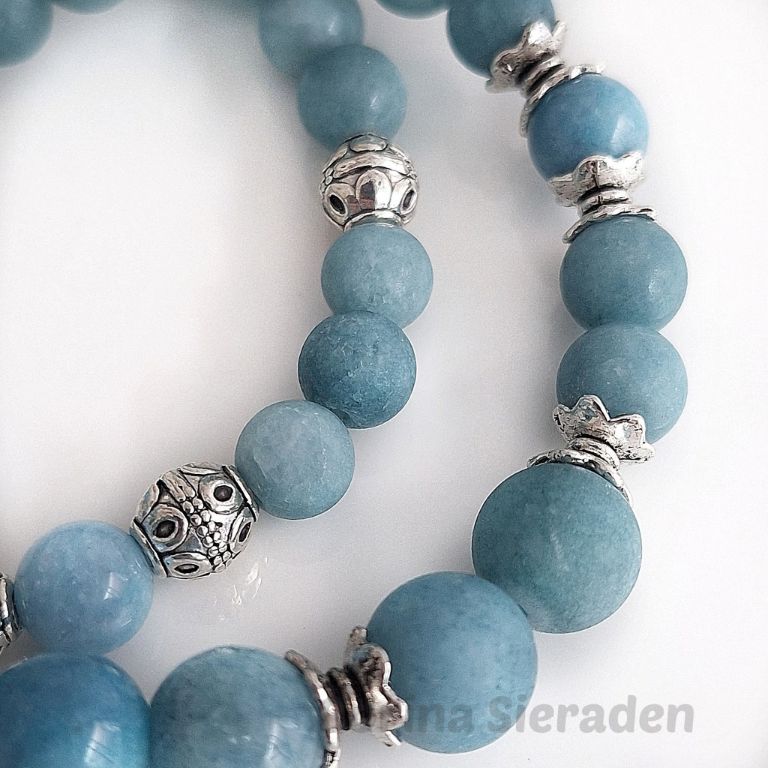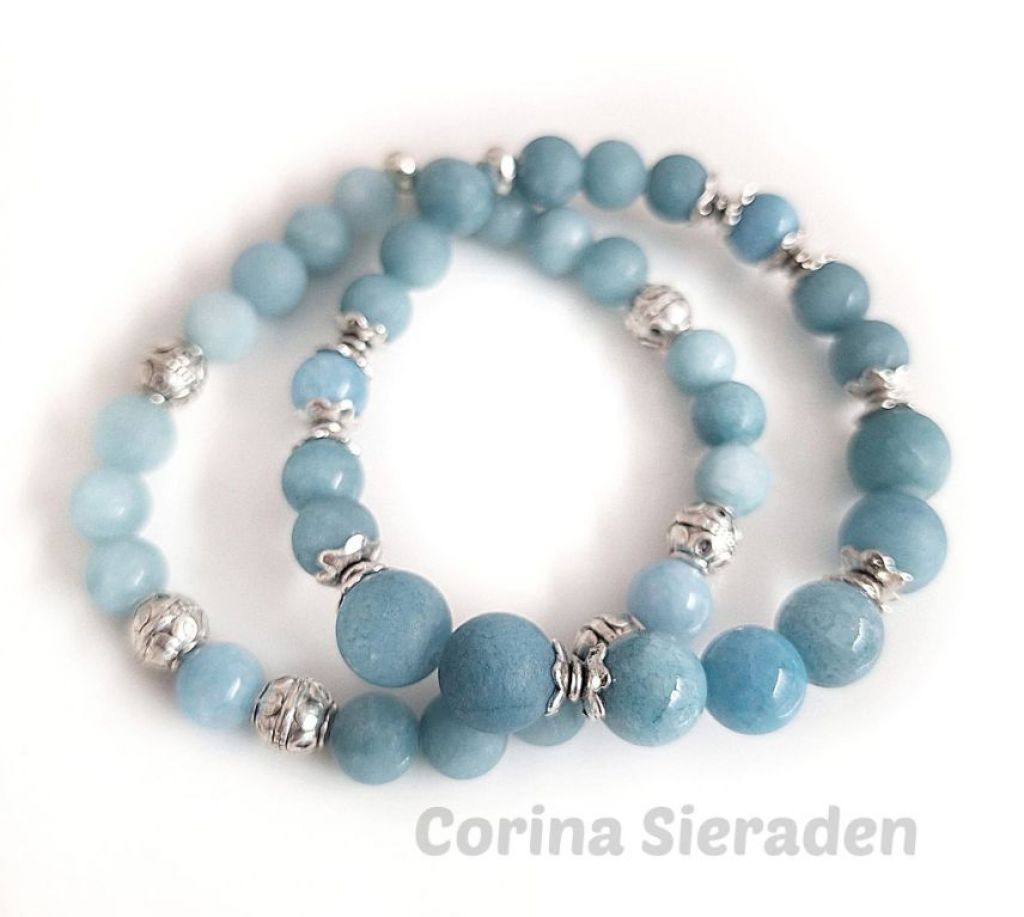 Armbandenset van prachtig blauwe chalcedoon (8 en 10 mm gepolijst en mat) en tibetaans zilver, geregen op elastiek.