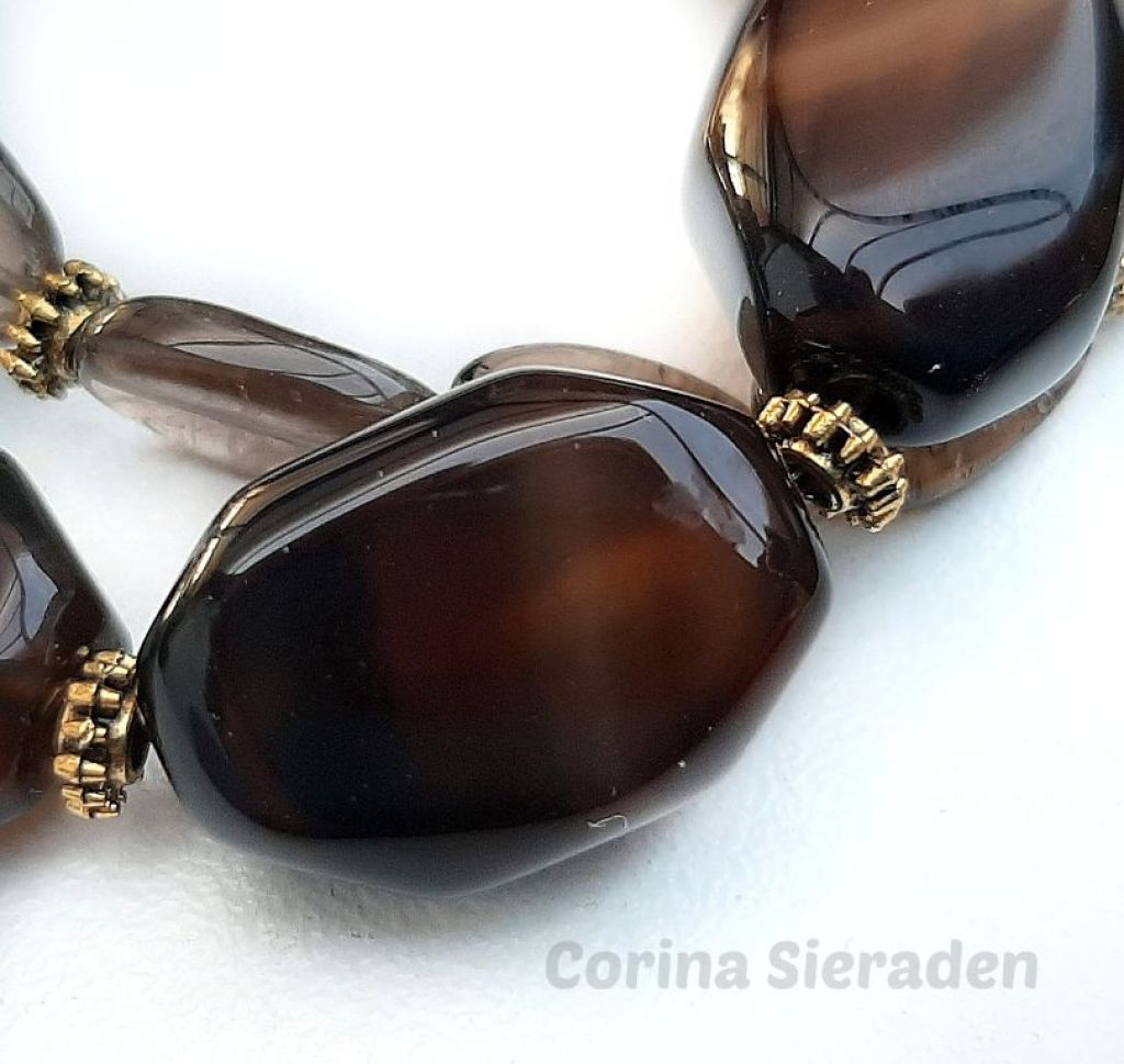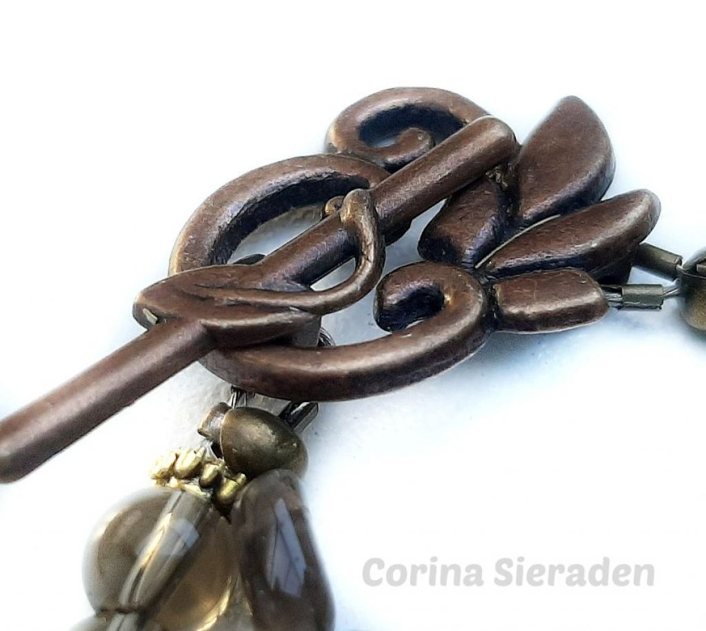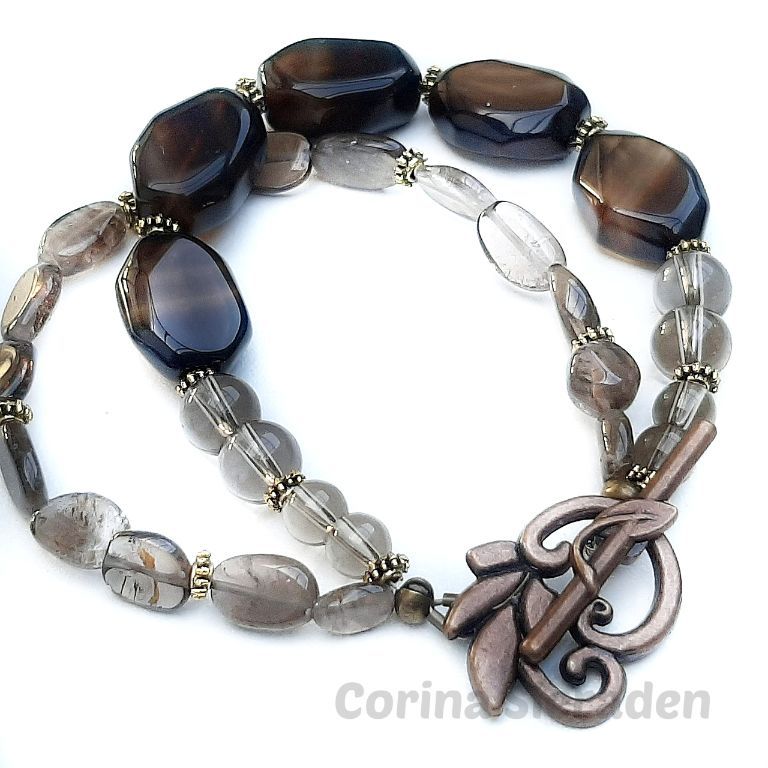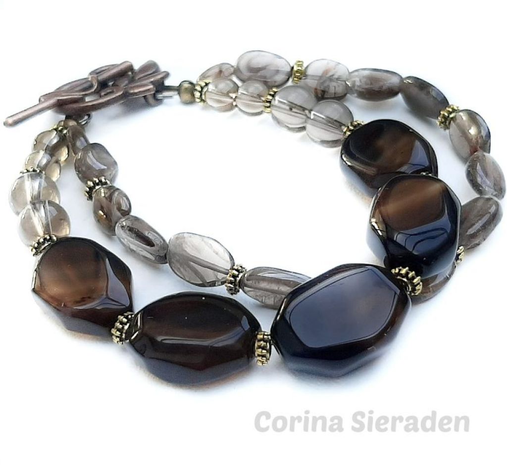 Dubbele armband met prachtige kralen van rookquartz en kapittelslot van brons.