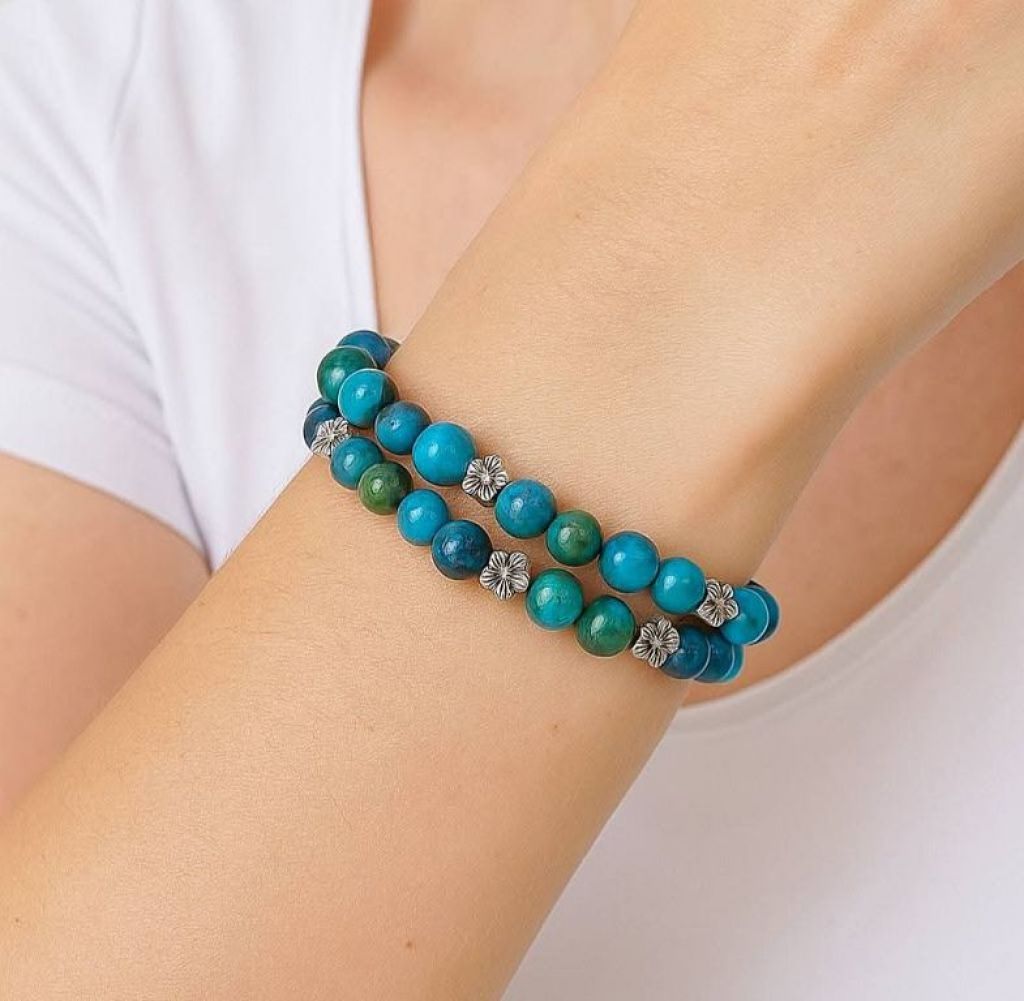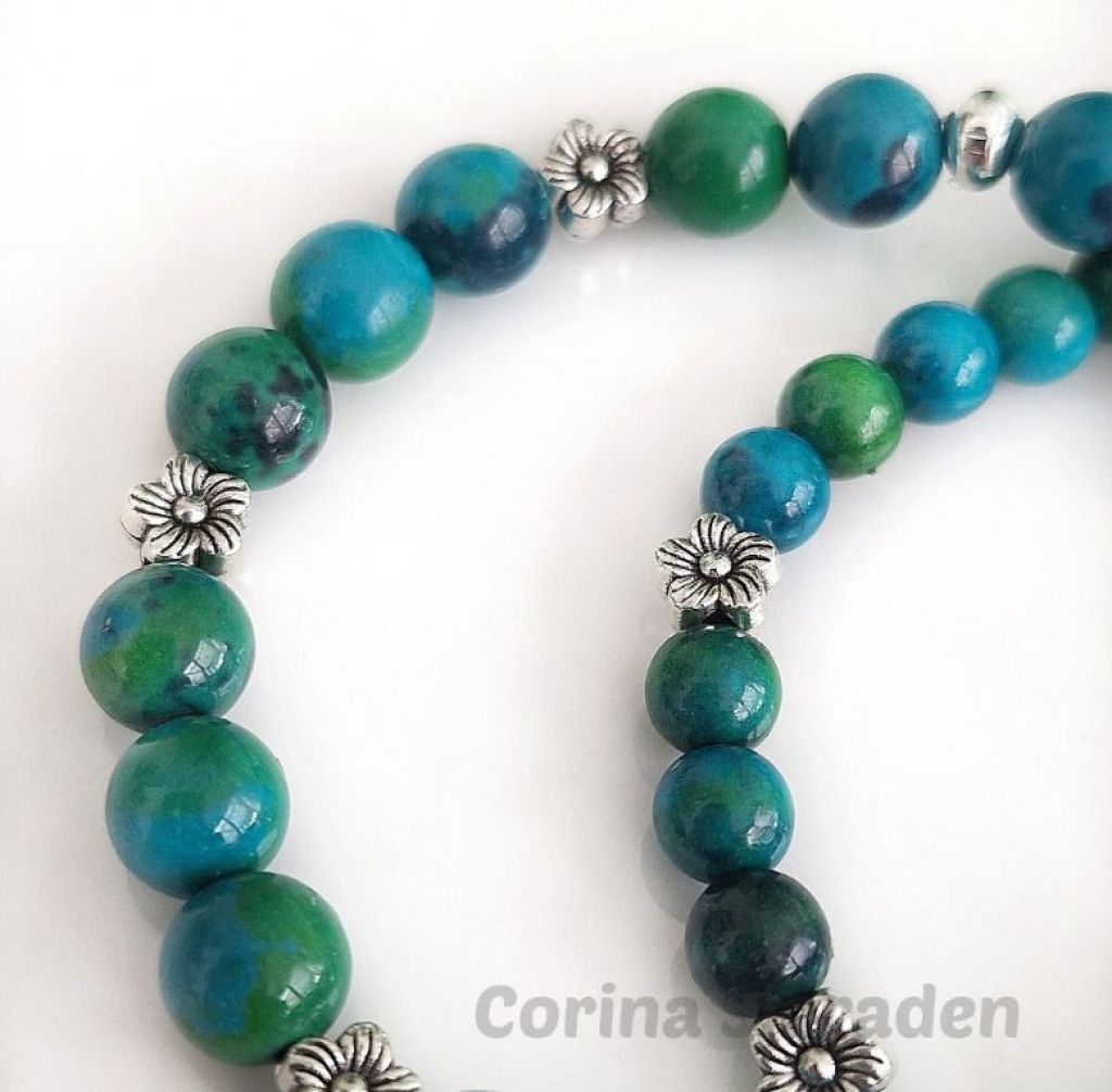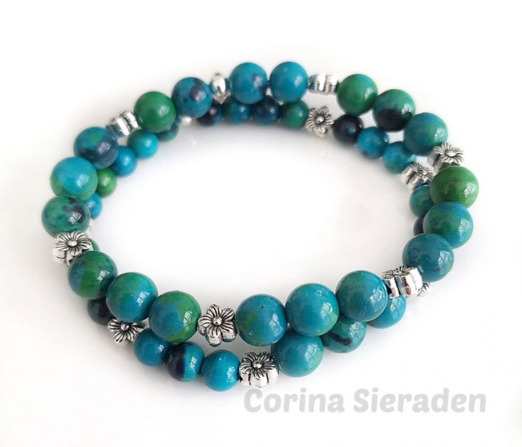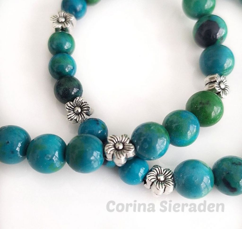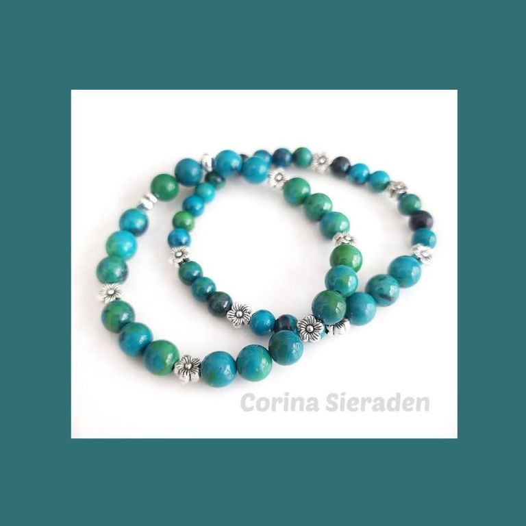 Armbandenset van chrysocolla (6 en 8 mm) en tibetaans zilver, geregen op elastiek.