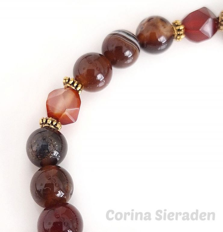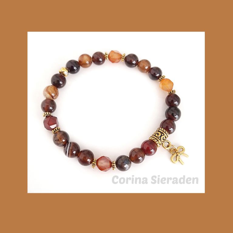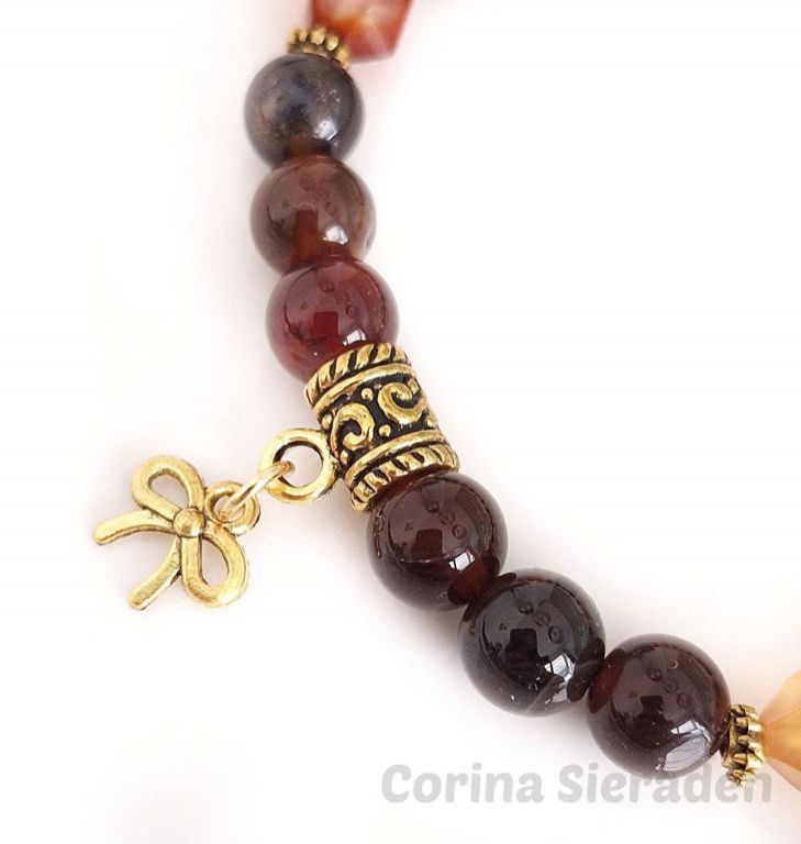 Armband van striped coffee agaat, facetgeslepen fantasy agaat en goudkleurige spacers, met bedel, geregen op elastiek.