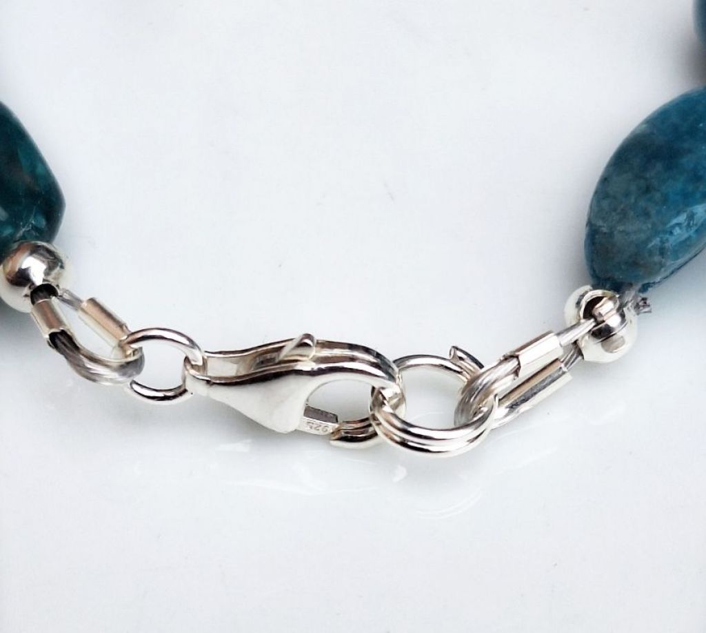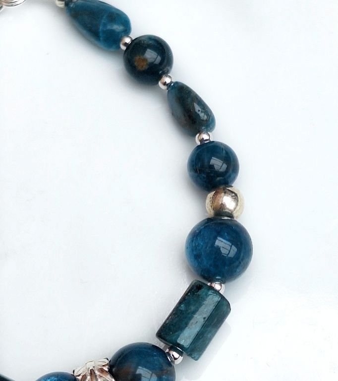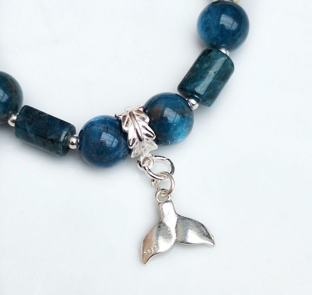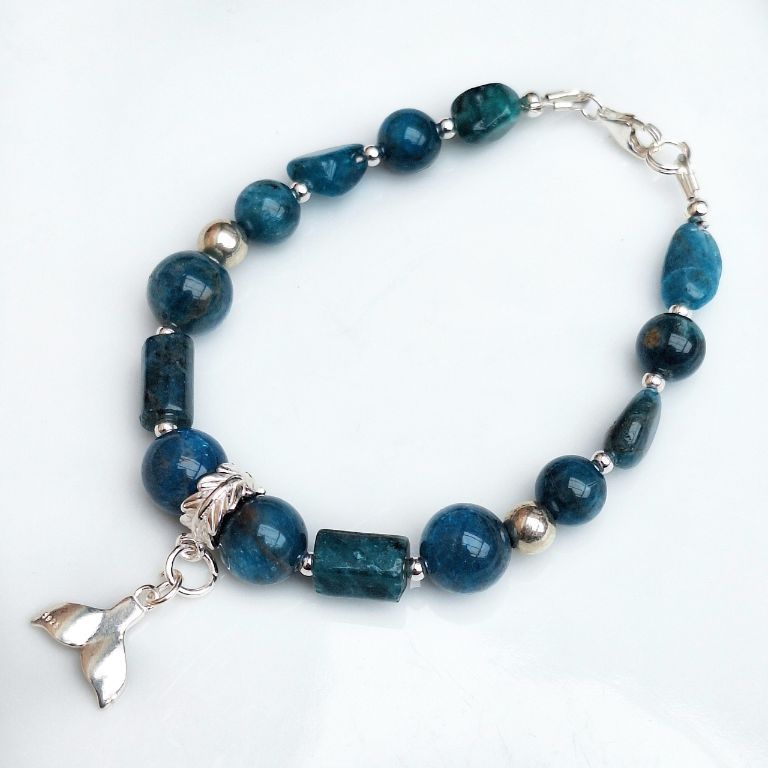 Unieke, handgemaakte armband van ocean apatiet (8 en 10 mm, onregelmatig en facetgeslepen cilinder) en sterling zilver, met sterling zilveren bedel vissenstaart en slotje.