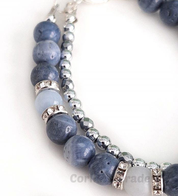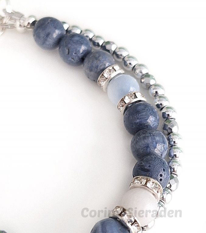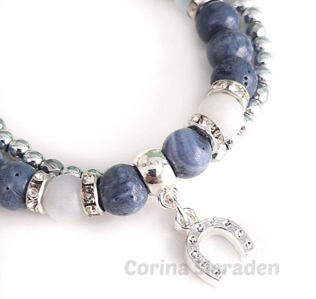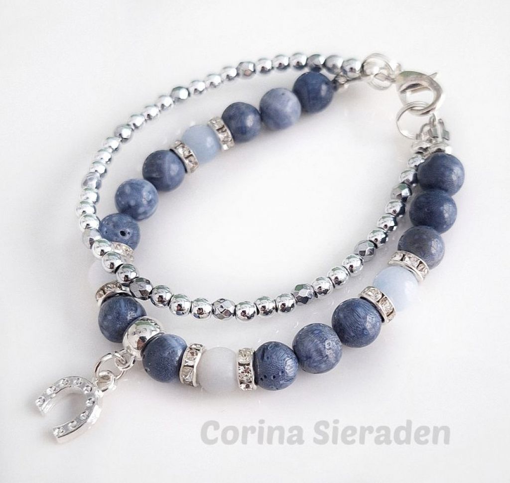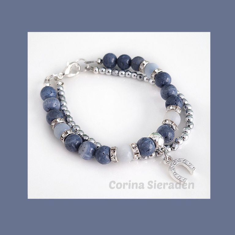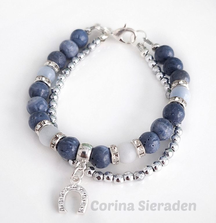 Bijzonder mooie, dubbele armband van blauwe koraal, jade, verzilverde hematiet (rond en facetgeslepen) en strass spacers, met verzilverde bedel hoefijzer.