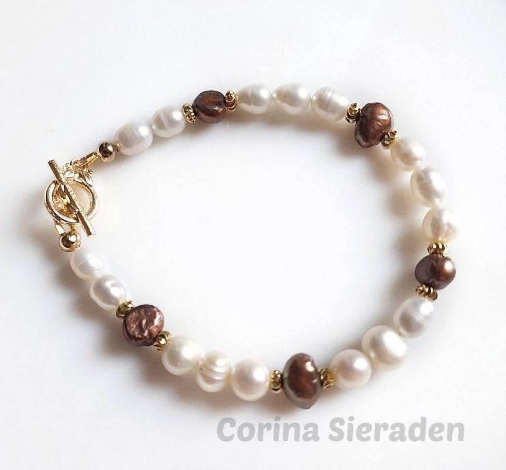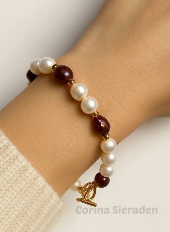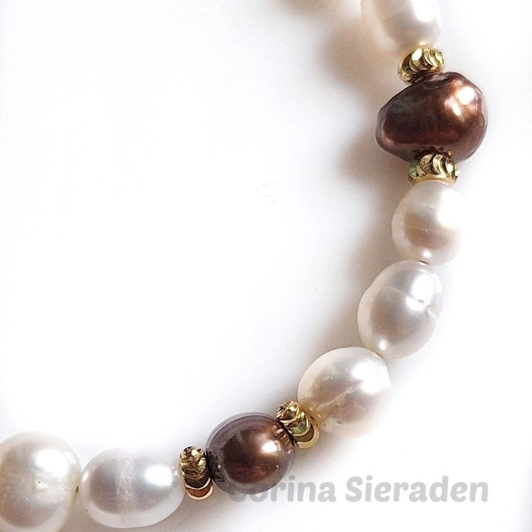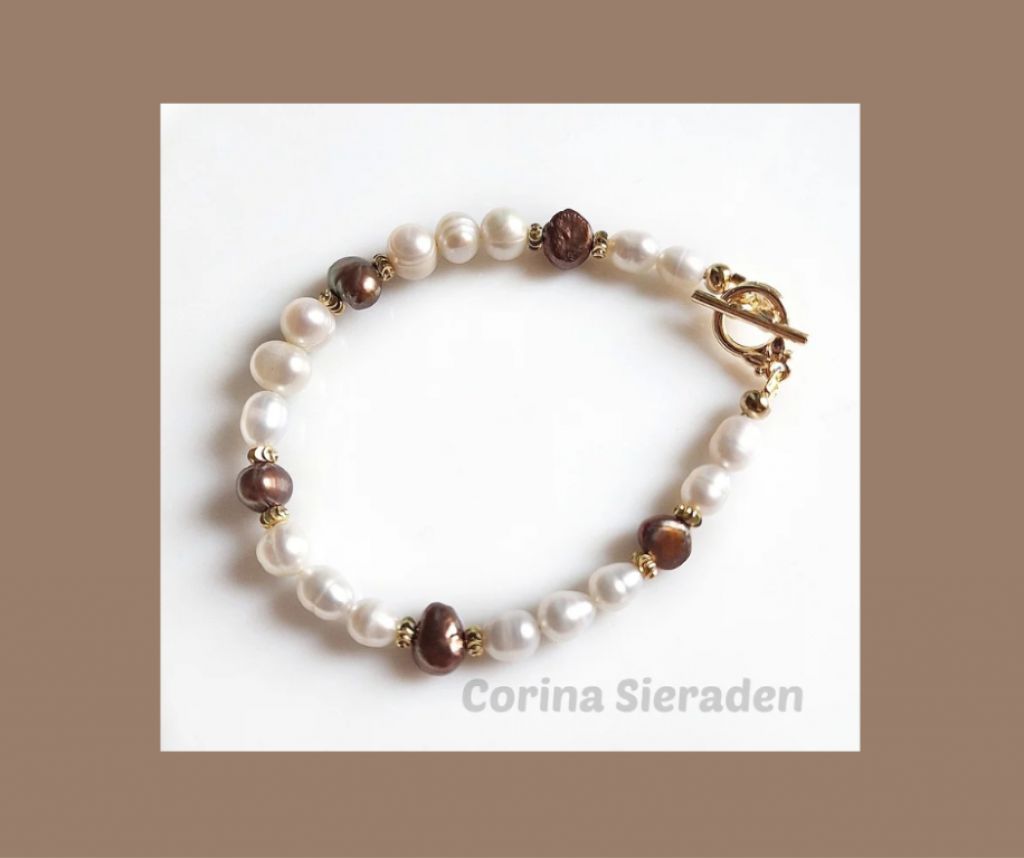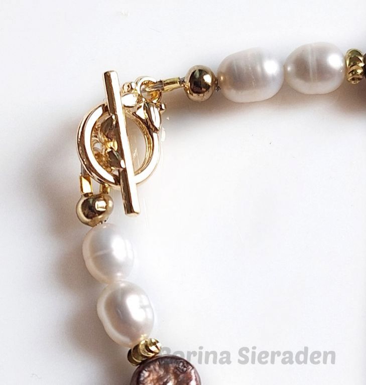 Ontdek deze elegante armband van zoetwaterparels en messing, met een stijlvol messing kapittelslot. Tijdloze klasse en vakmanschap in één sieraad.