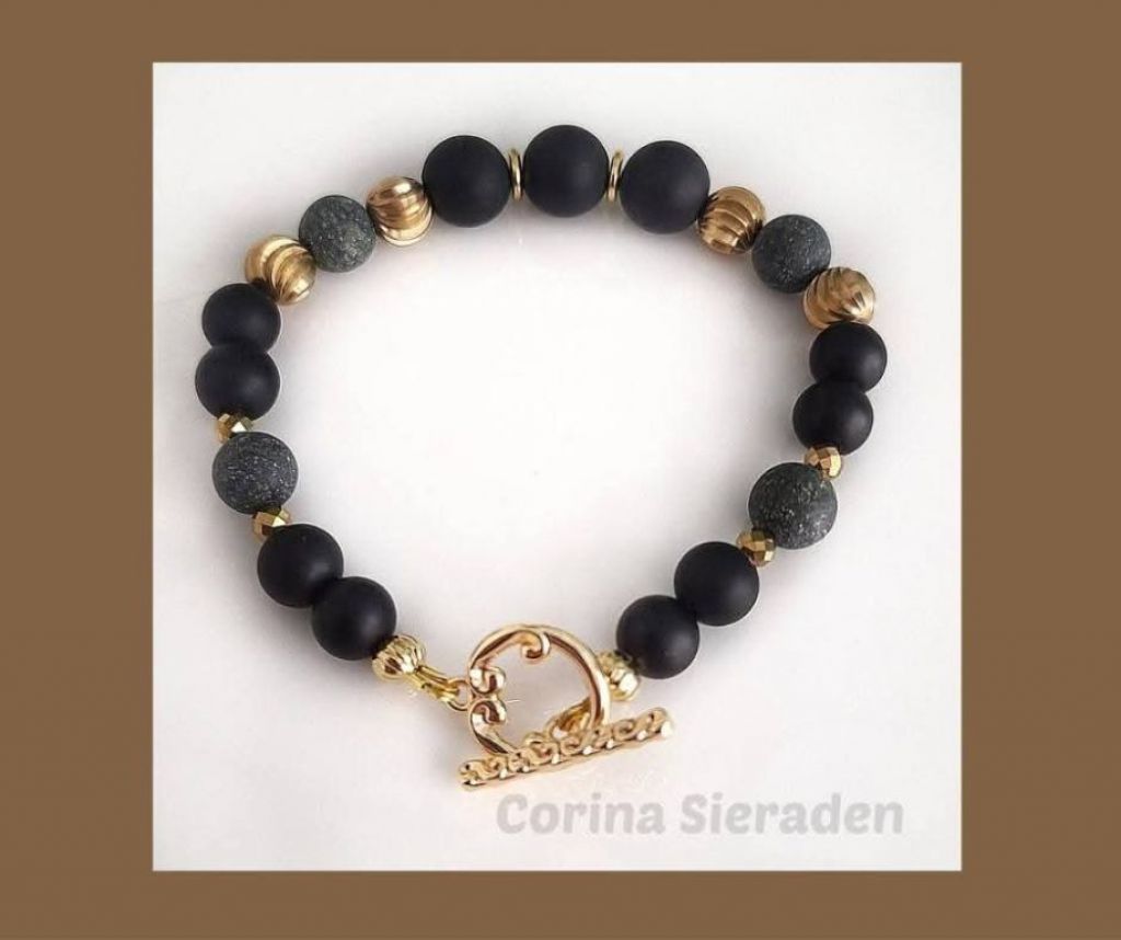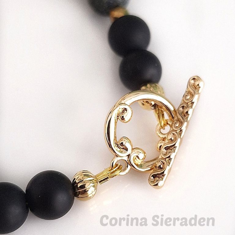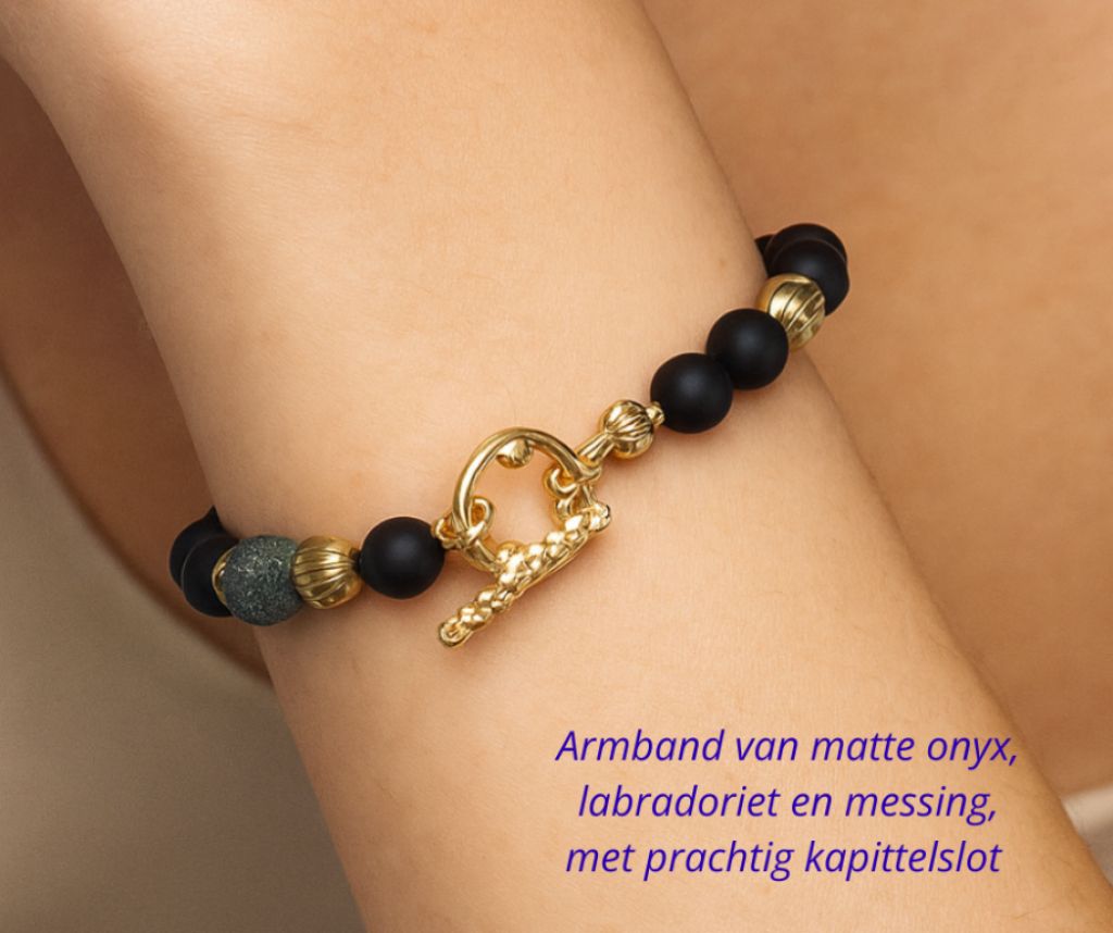 Deze handgemaakte armband van matte onyx en matte labradoriet is afgewerkt met gedraaide messing kralen en een prachtig kapittelslot, een tijdloze favoriet voor elke look.
