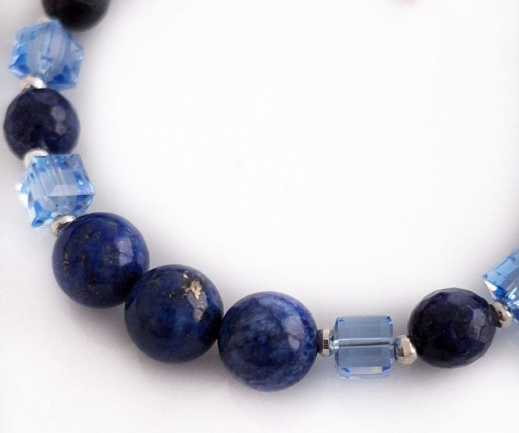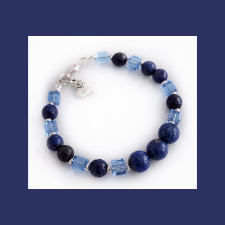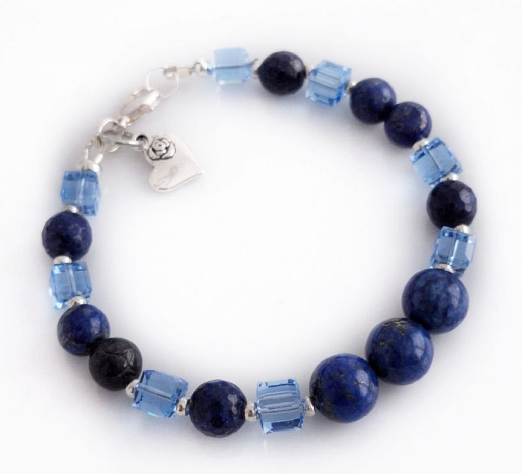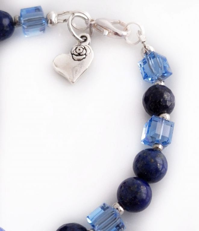 Unieke, handgemaakte armband van lapis lazuli (8, 10 mm rond en 8 mm facetgeslepen), Swarovski blokkralen en zilverkleurige spacers, met bedel hart.
