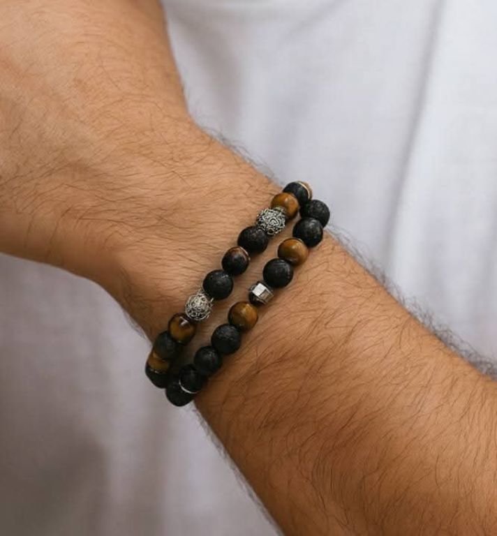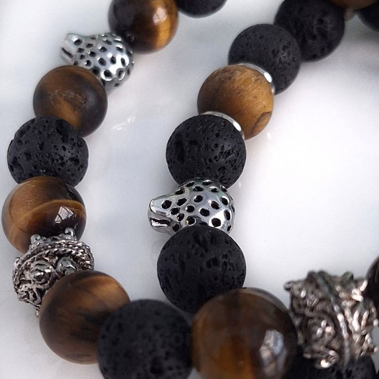 Stoere heren armbandenset van tiger eye (mat en glanzend 12 mm), lavasteen (12 mm) en tibetaans zilver.