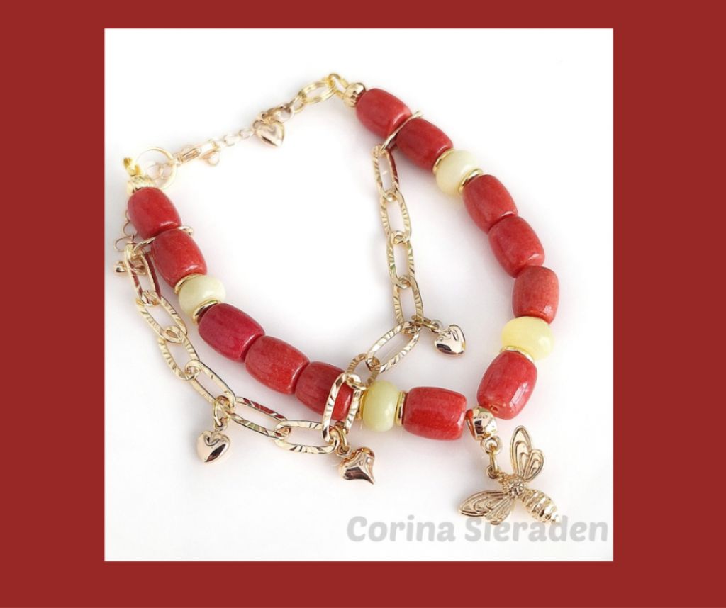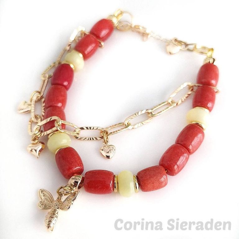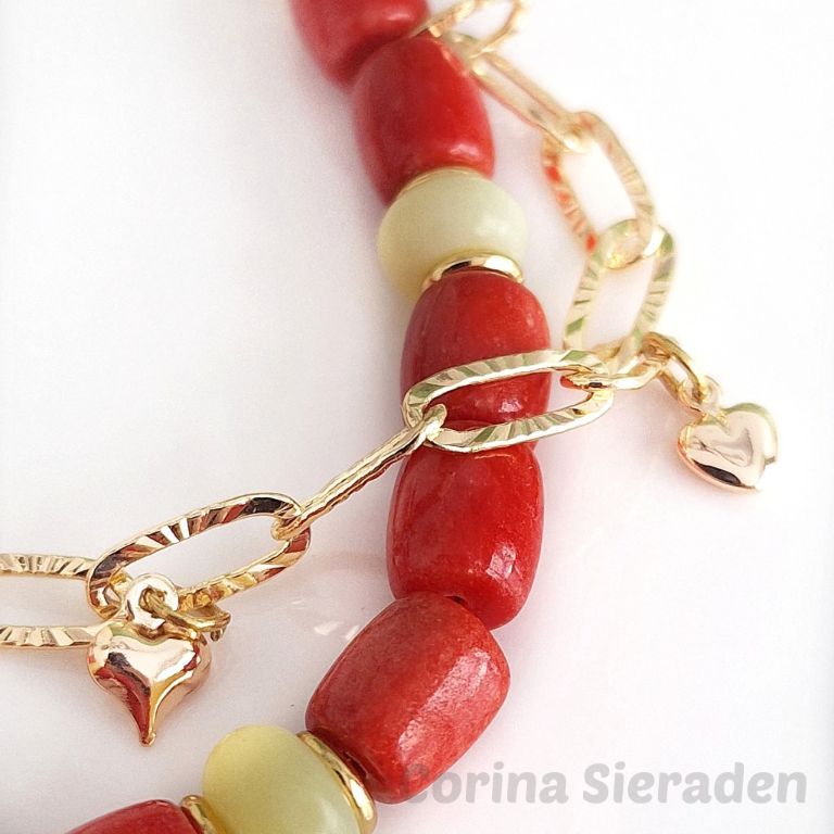 Handgemaakte dubbele armband van rode koraal tonnetjes, lemon jade rondelles en messing spacers, met messing jasseron. De armband is afgewerkt met meerdere messing bedels en verlengkettinkje.