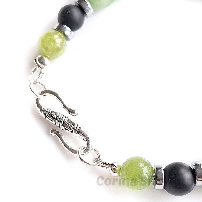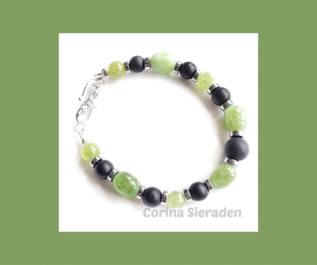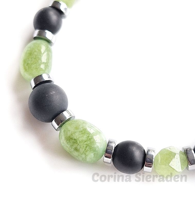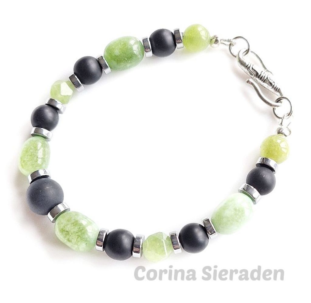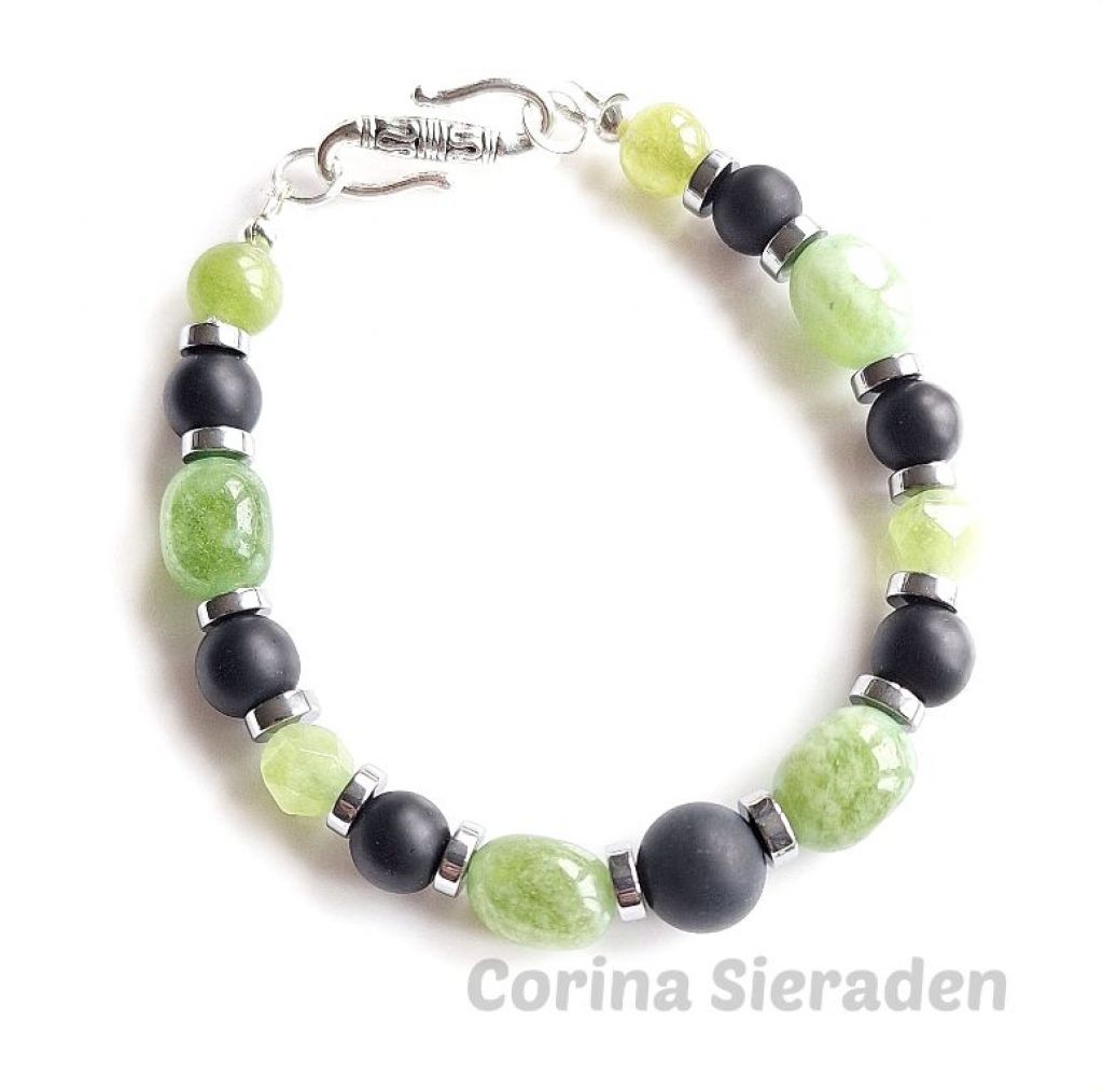 Armband van green peridot, matte onyx en verzilverde hematiet met apart verzilverd haakslotje. Handgemaakt, stijlvol en perfect voor elke dag.