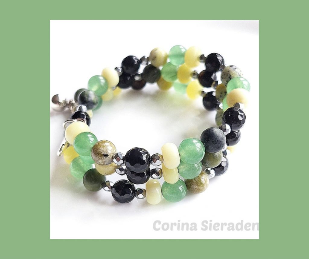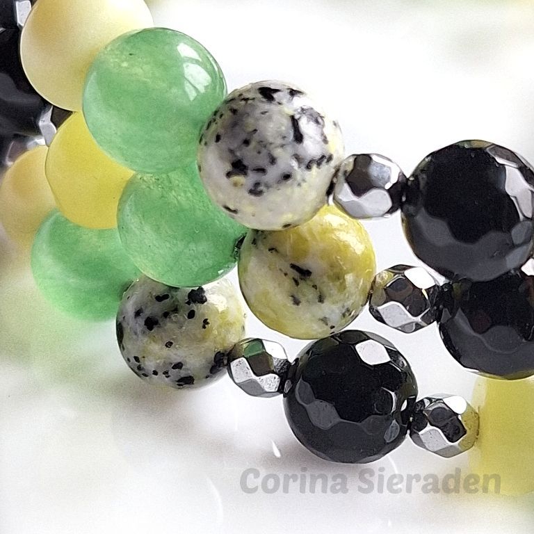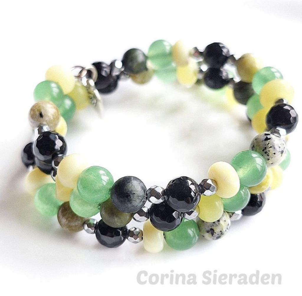 Speelse memory wire armband van jade, jaspis en onyx met verzilverde hematiet en bedeltjes. Past altijd door het spiraalvormige design.