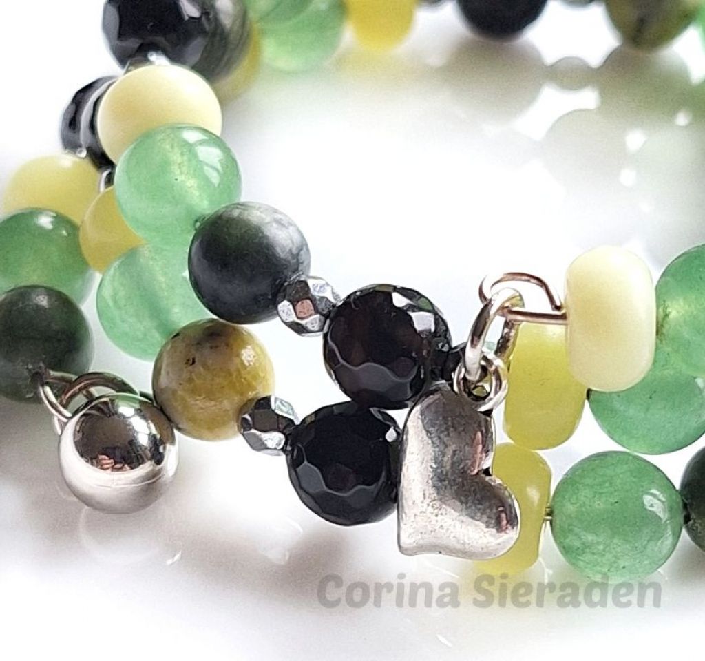 CORINA SIERADEN Handgemaakte armbandenset van green jade en lemon jade met messing kralenkapjes, bedel en kapittelslot, gecombineerd met een elastische jade-messing armband. Polsmaat: 18 cm.