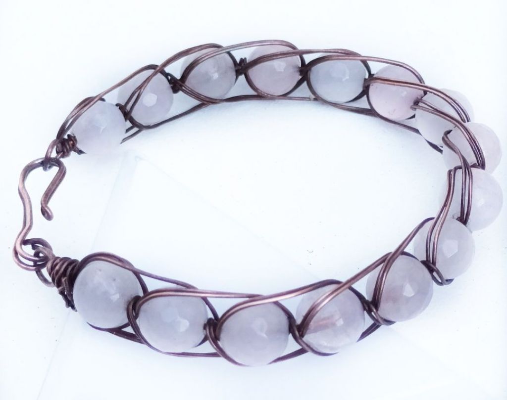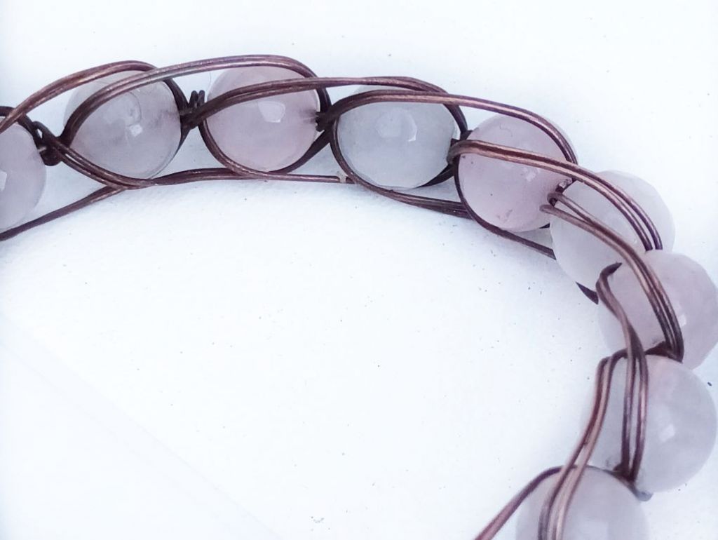 Handgemaakte wire wrapped armband met ronde en facetgeslepen rozenkwarts, elegant verwerkt in geoxideerd koperdraad. Uniek, liefdevol design en perfect als persoonlijk cadeau.
