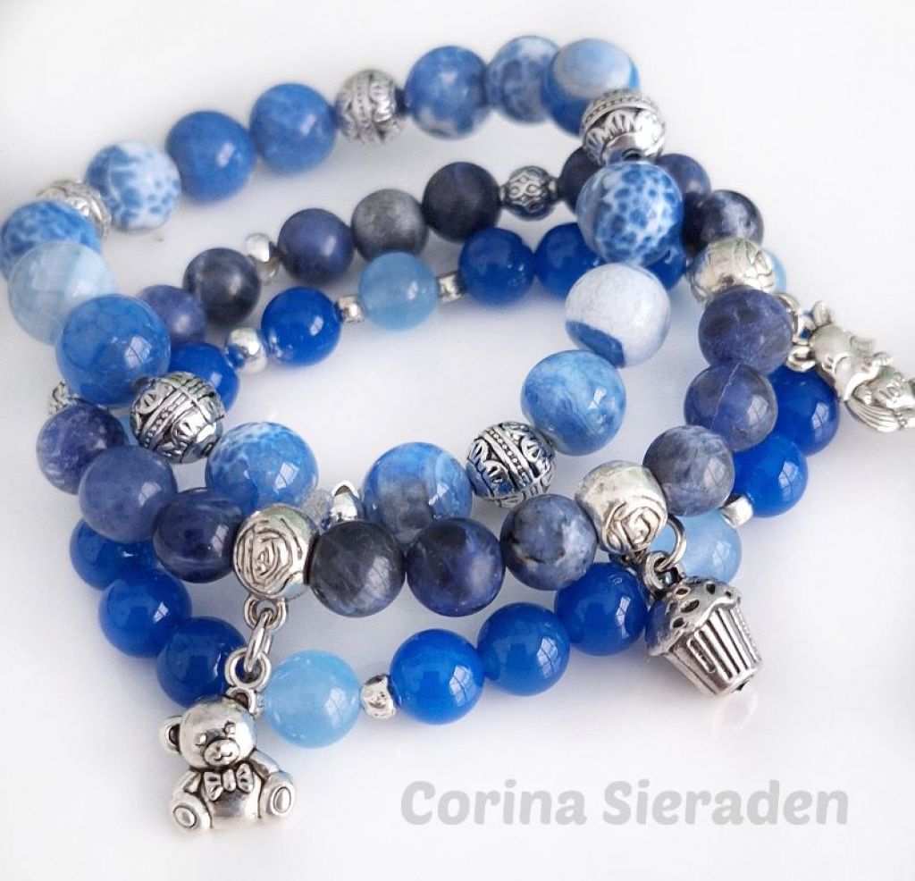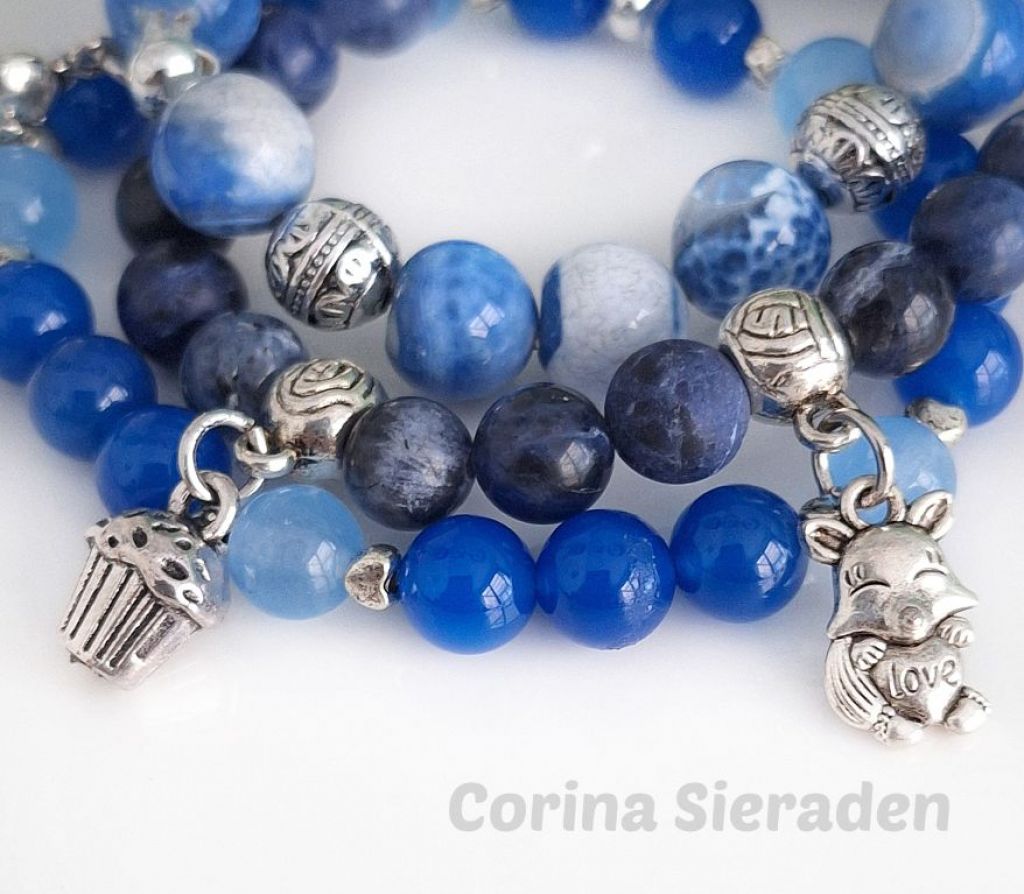 Elegante 3-delige armbandenset van fire agaat, agaat, sodaliet en tibetaans zilver, afgewerkt met speelse bedels en geregen op sterk elastiek.