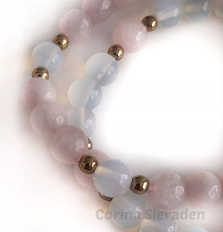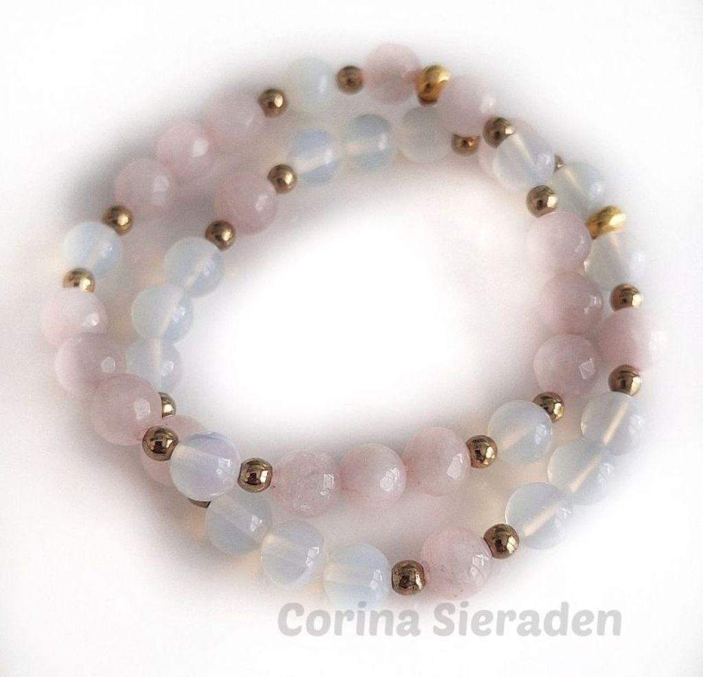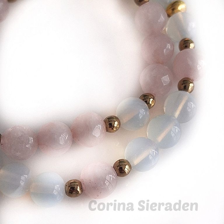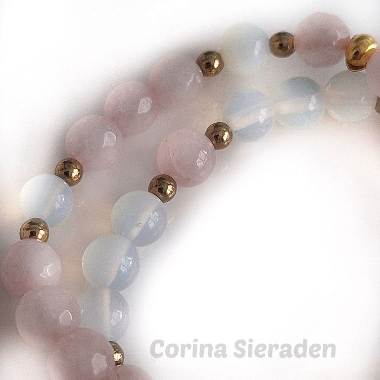 Handgemaakte armband van ronde en facetgeslepen rozenkwarts, opaliet en goudkleurige hematiet. Geregen op elastiek voor optimaal draagcomfort.