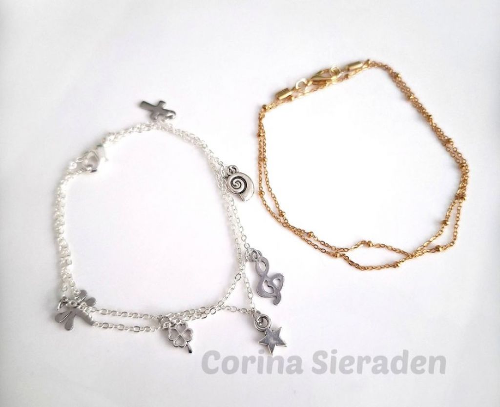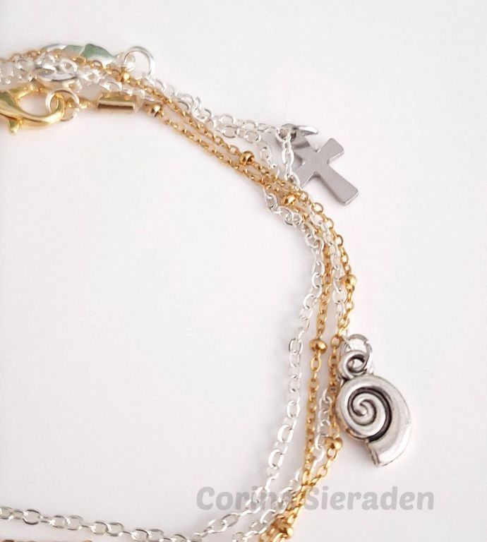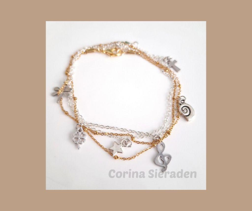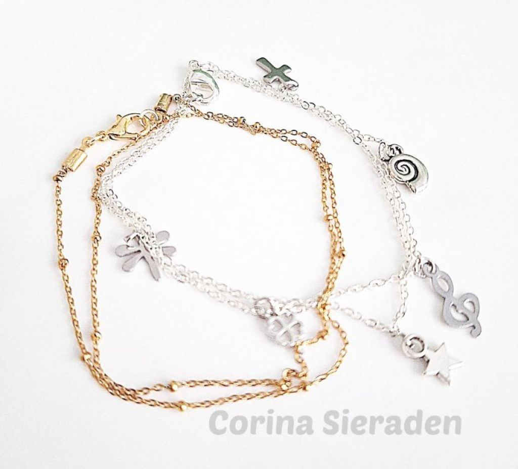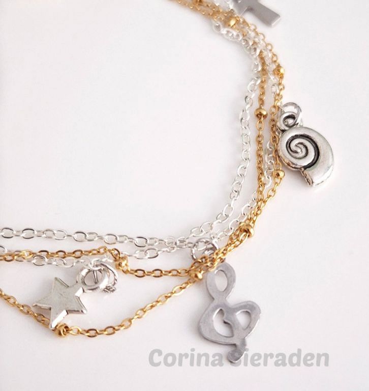 Mix & match armbandenset van verguld en verzilverd jasseron met subtiele bedeltjes.