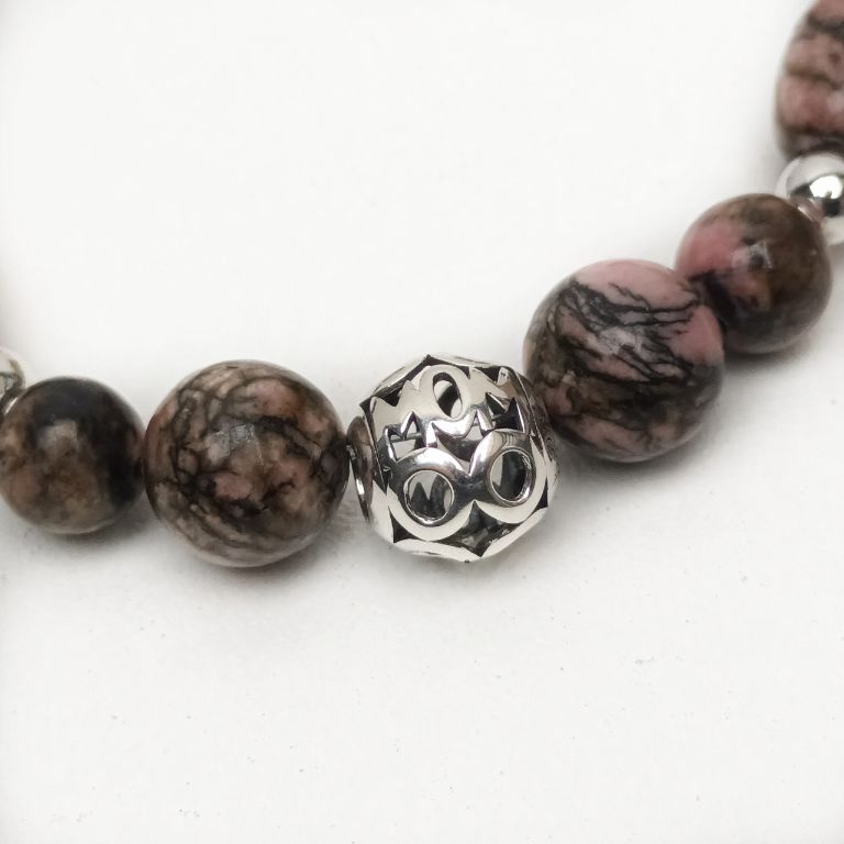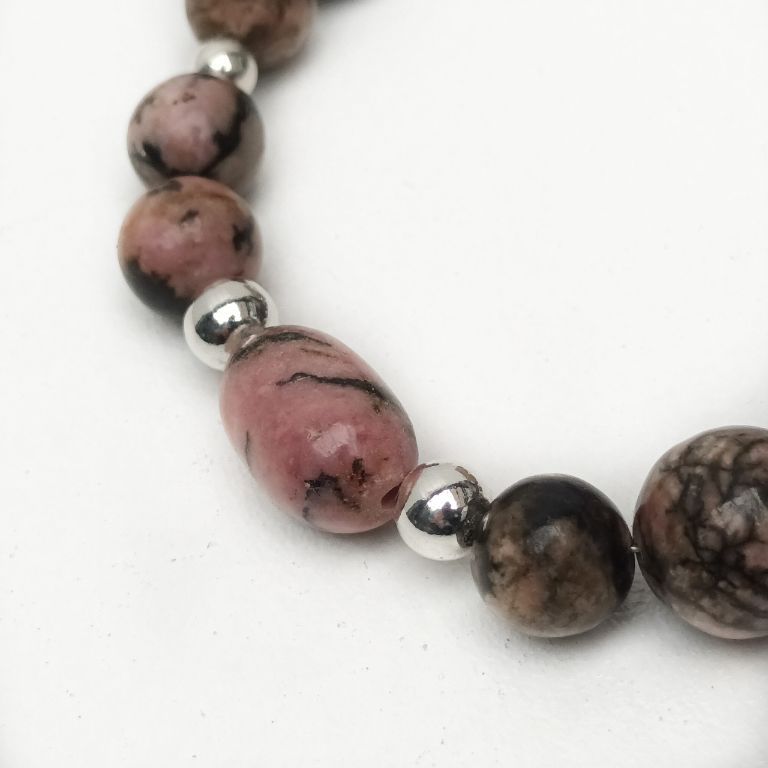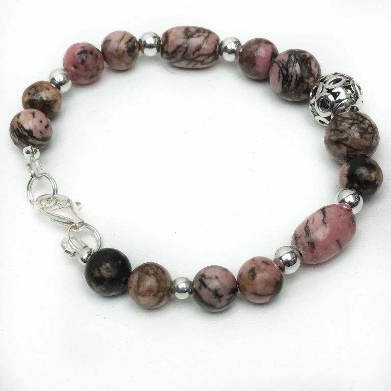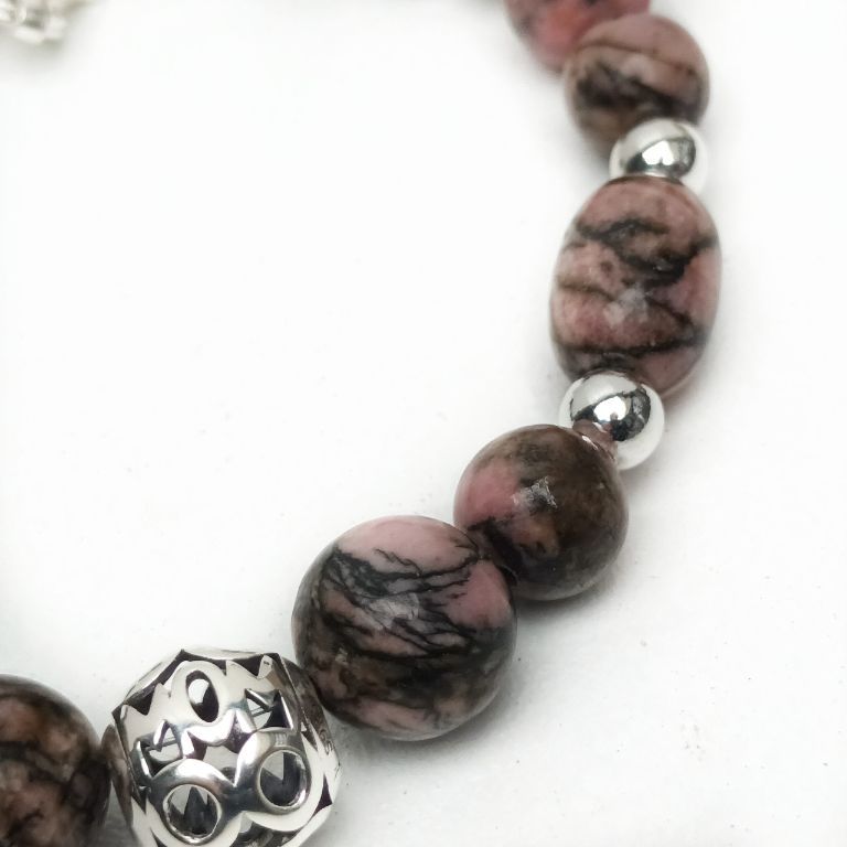 Luxe, handgemaakte armband van rhodoniet en STERLING ZILVER 925 kralen en slotje.