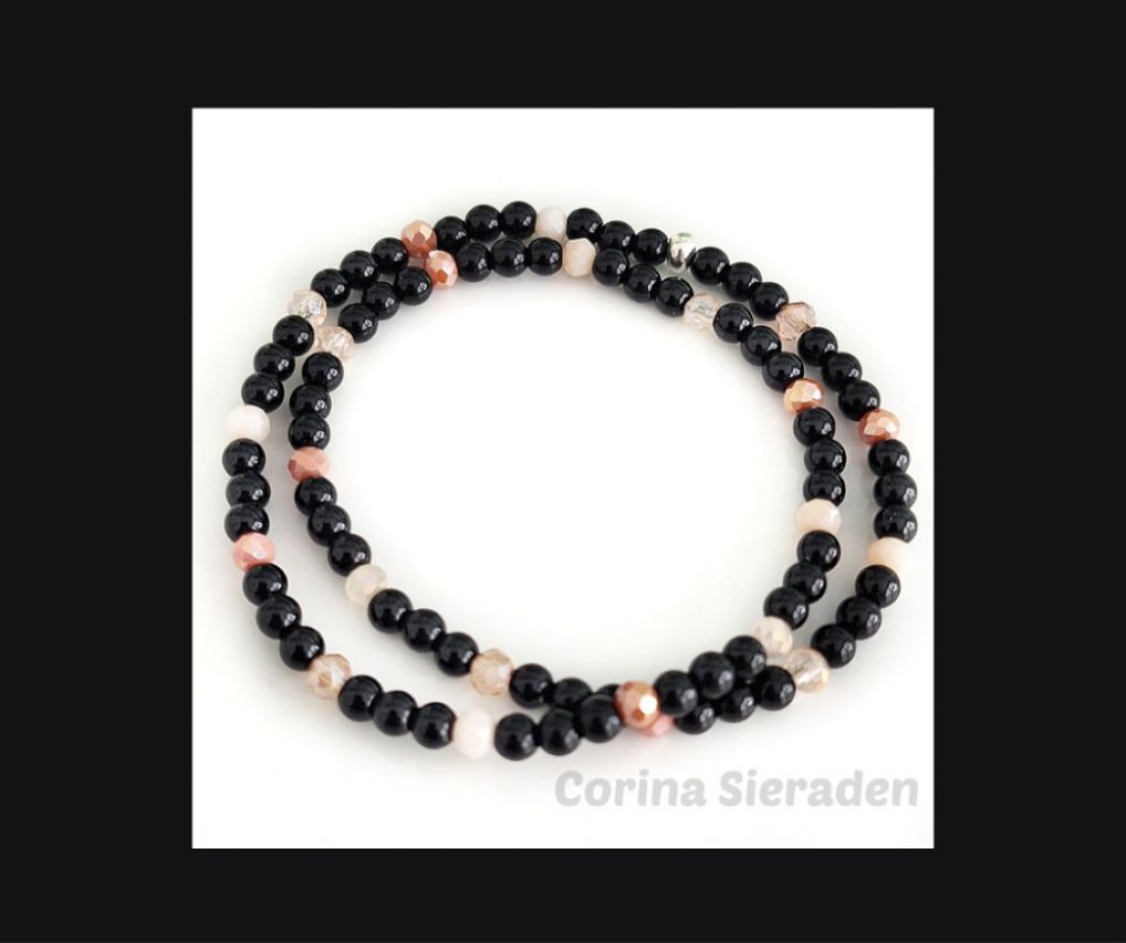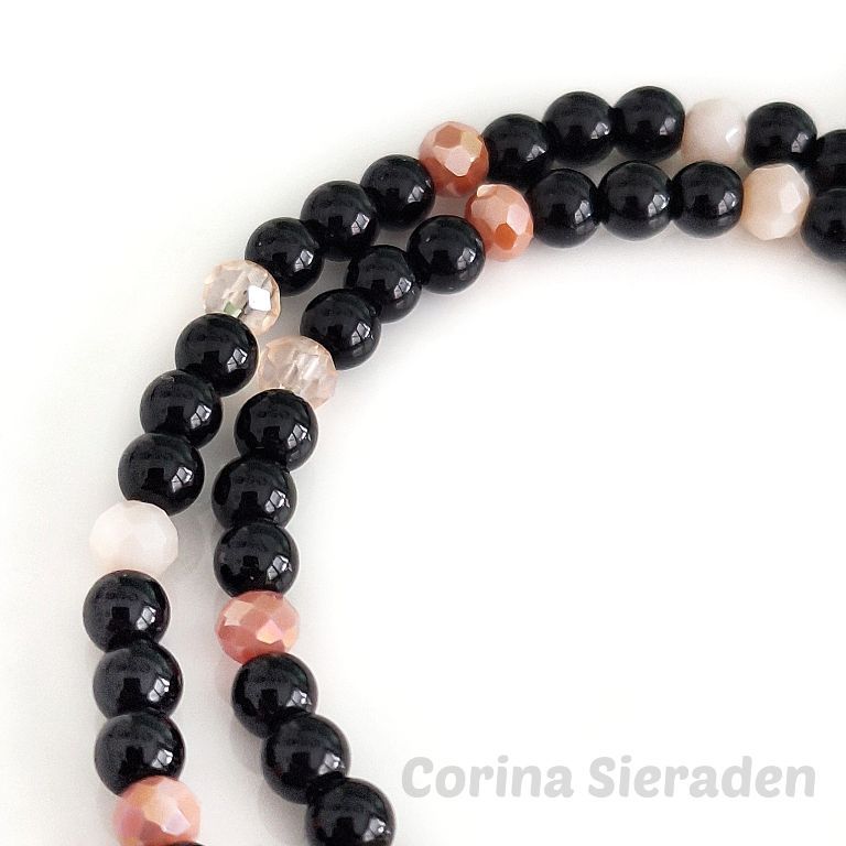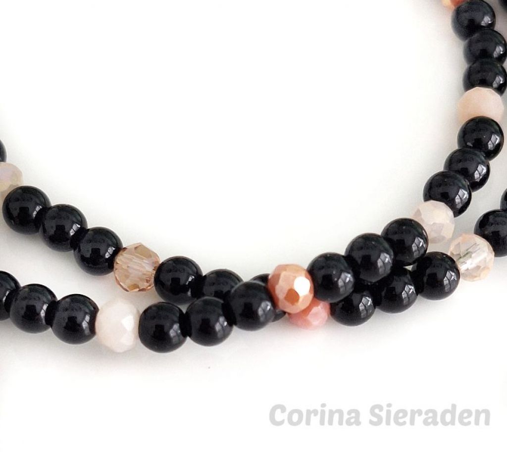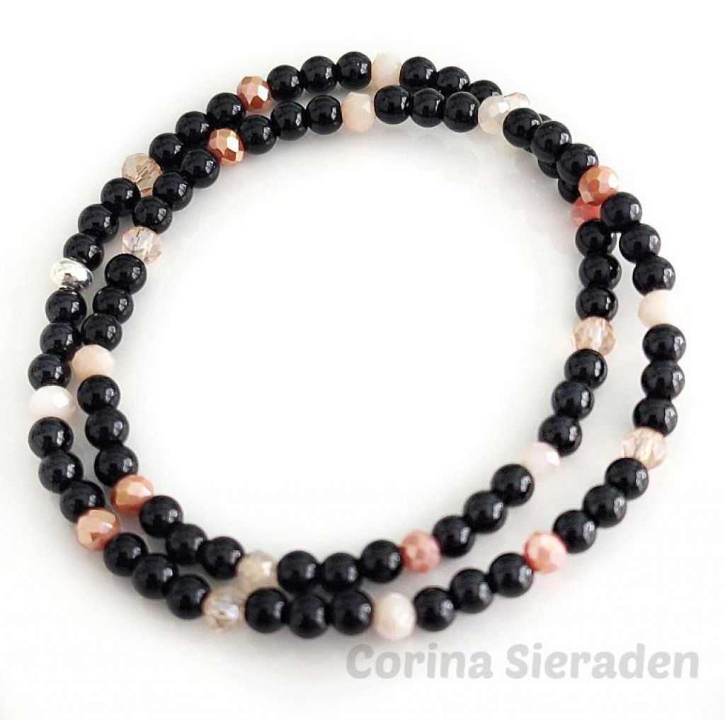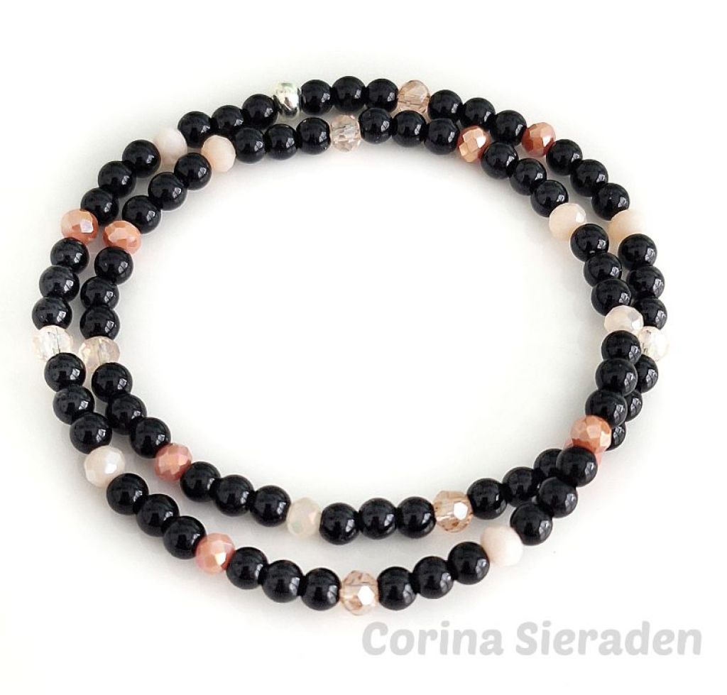 Deze handgemaakte wikkelarmband combineert onyx met glinsterende kristallen facetkraaltjes, geregen op elastiek.