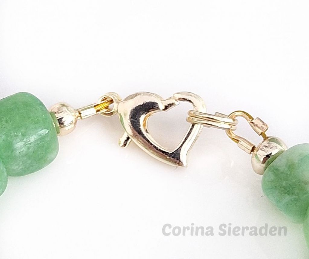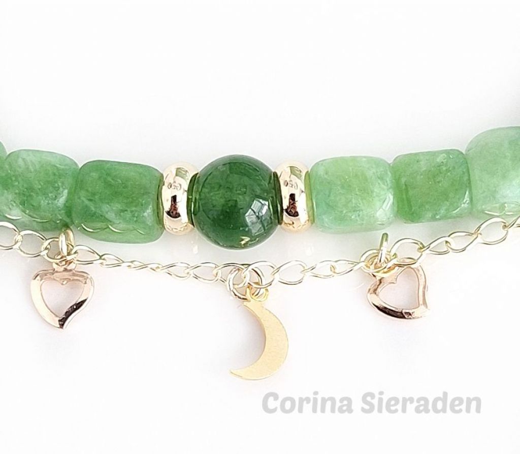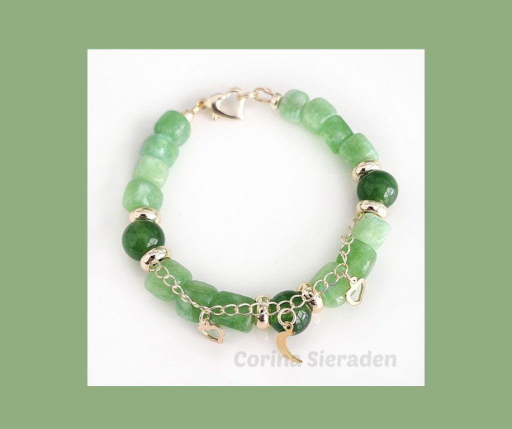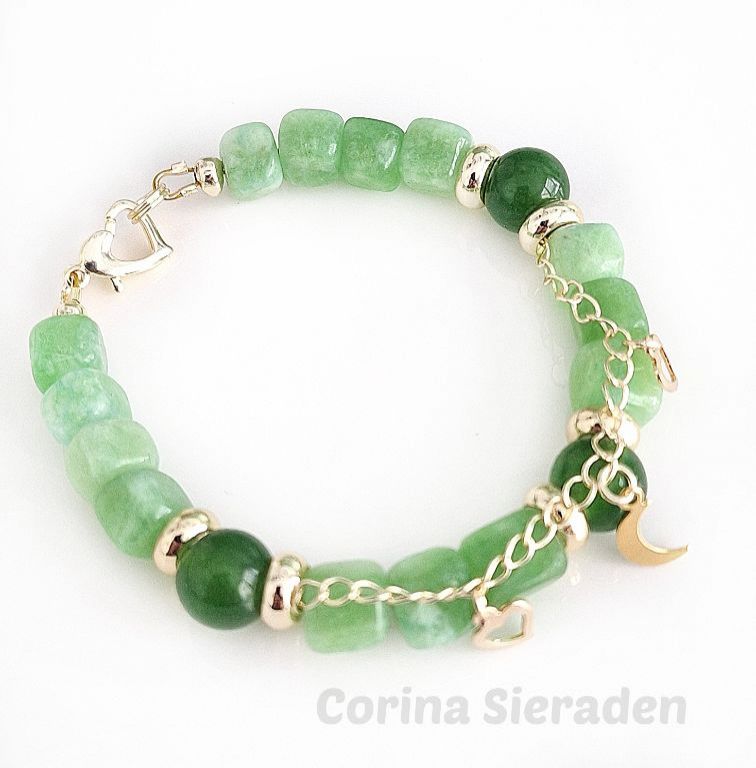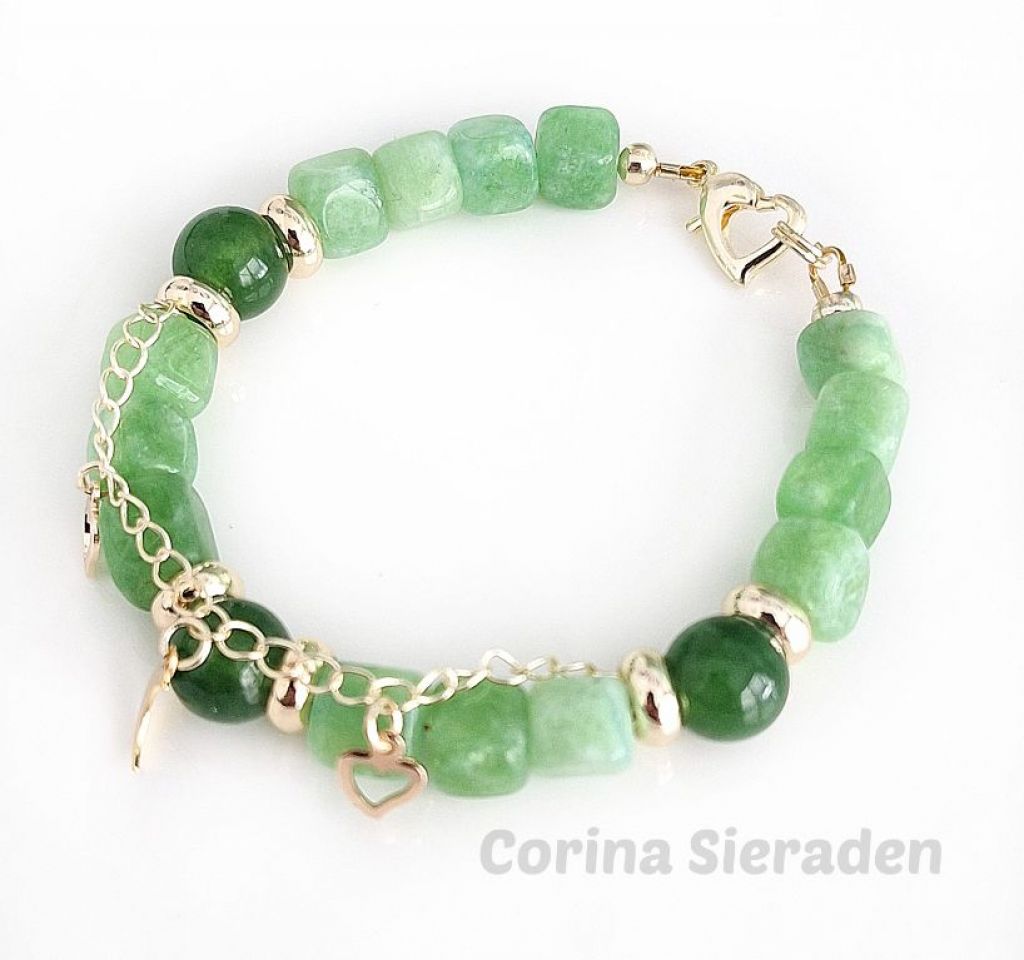 Deze armband van green peridot en jade - afgewerkt met vergulde spacers, jasseron met bedeltjes en hartslotje - straalt balans, elegantie en natuurlijke energie uit