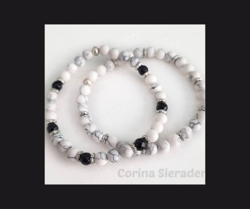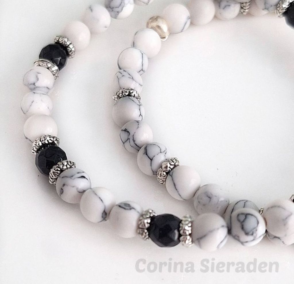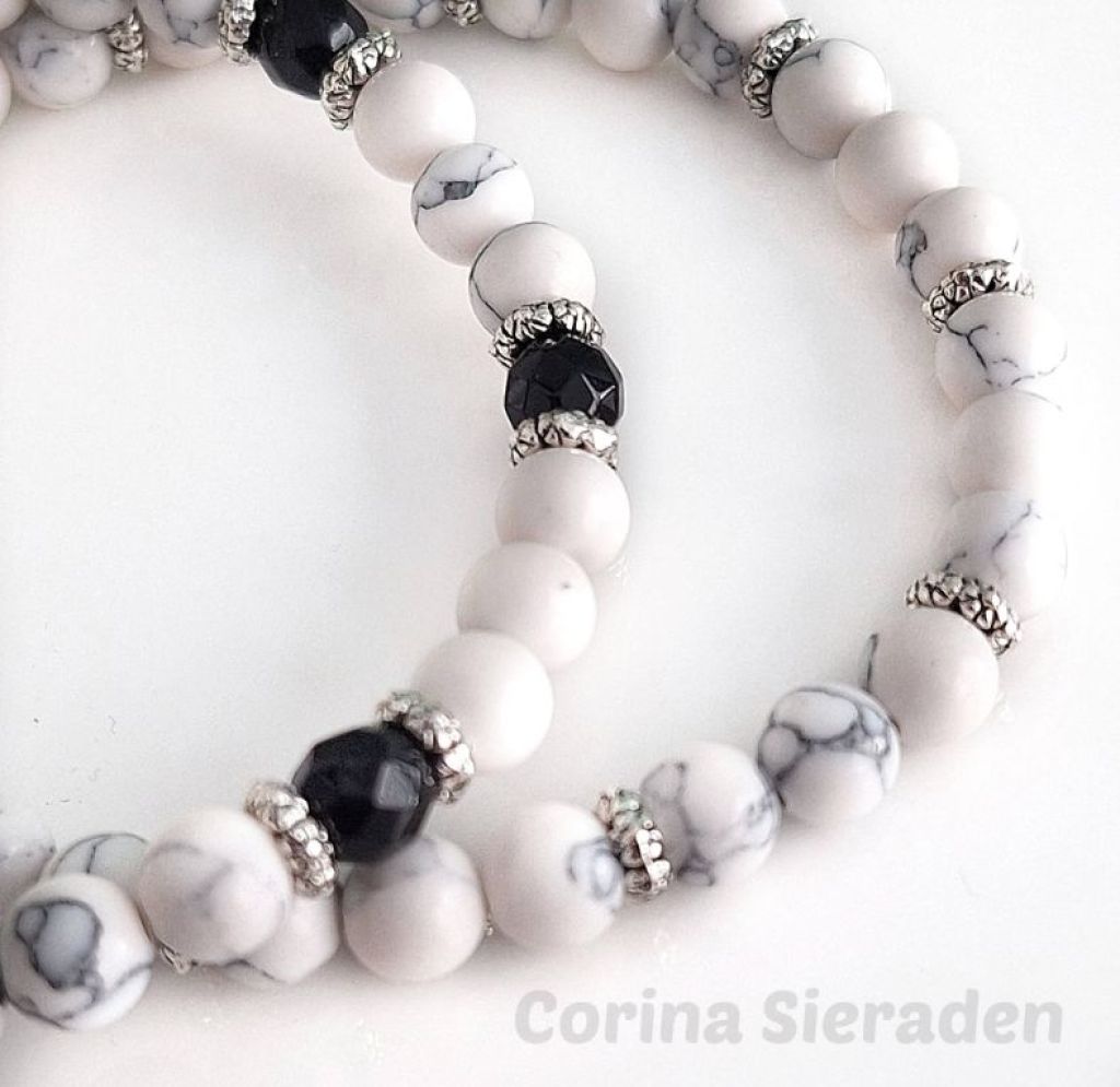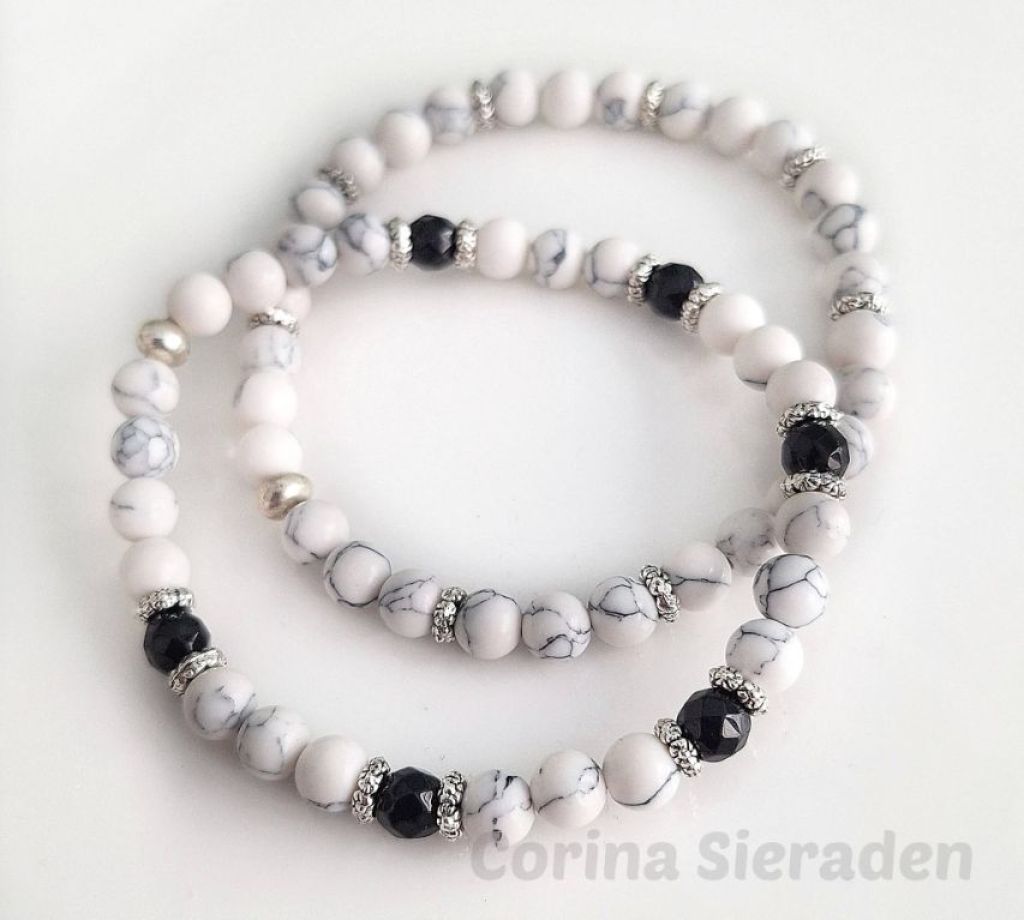 Deze stijlvolle armbandenset is geregen met howliet, facetgeslepen chalcedoon en afgewerkt met Tibetaans zilver. De zachte kleurtinten combineren moeiteloos met elke outfit – van casual tot chic.