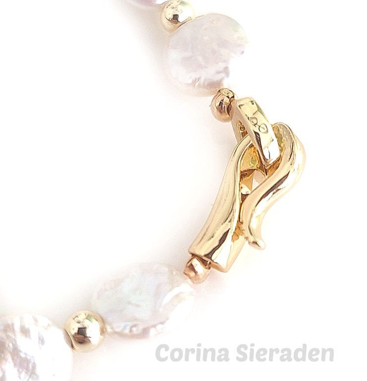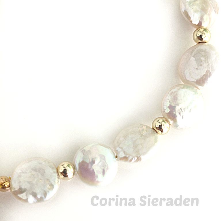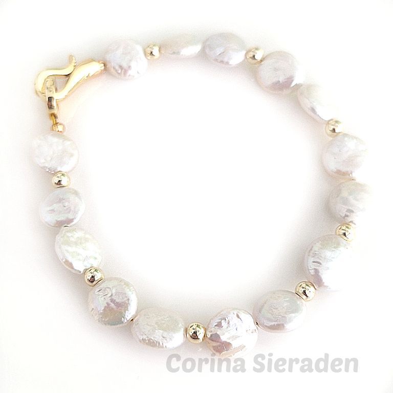 CORINA SIERADEN Armband van platte parels met vergulde tussenkralen en een stijlvol verguld slotje. Polsmaat: 18-19 cm.