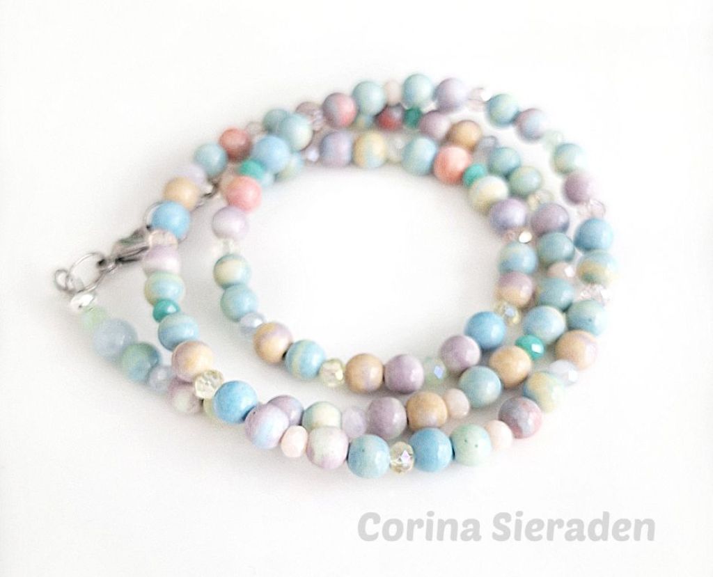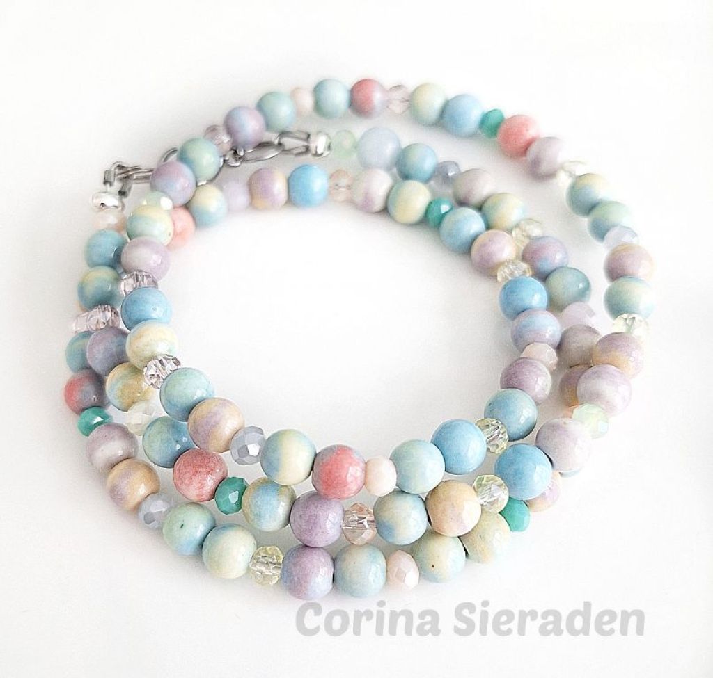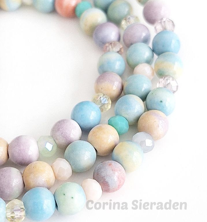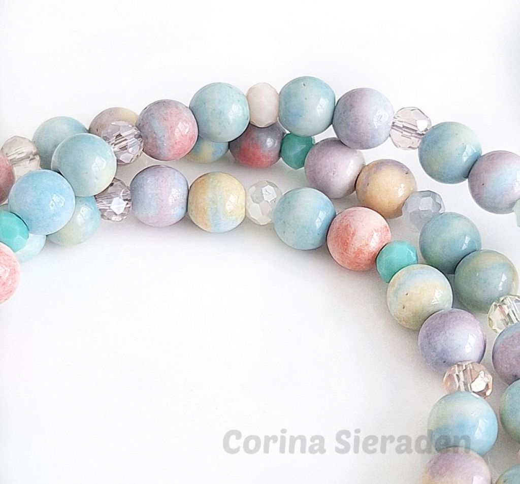 CORINA SIERADEN Veel mensen dragen graag sieradensetjes. Deze keer heb ik een schattig setje gemaakt: Armband van rode jade (8 mm rond en facetgeslepen), kunziet (8 mm) en tibetaans zilver, geregen op elastiek. Polsmaat: 19 cm. ...