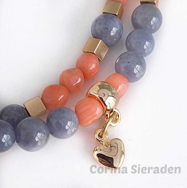 CORINA SIERADEN Deze dubbele armband is een prachtige combinatie van facetgeslepen aardbeienkwarts, agaat en chalcedoon. De zachte tinten worden versterkt door vergulde tussenkralen, een verfijnd slotje en een lief hartbedeltje als ...