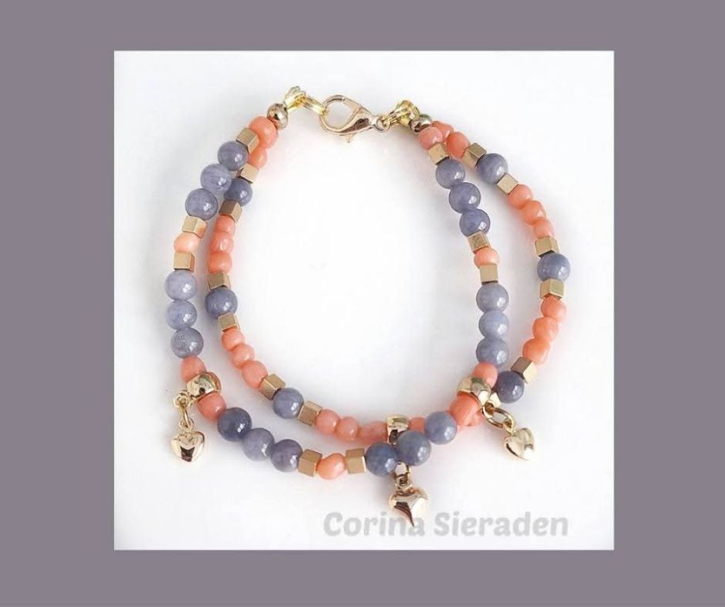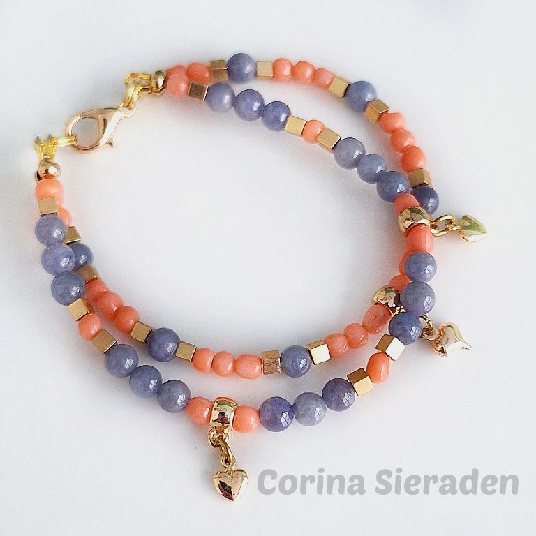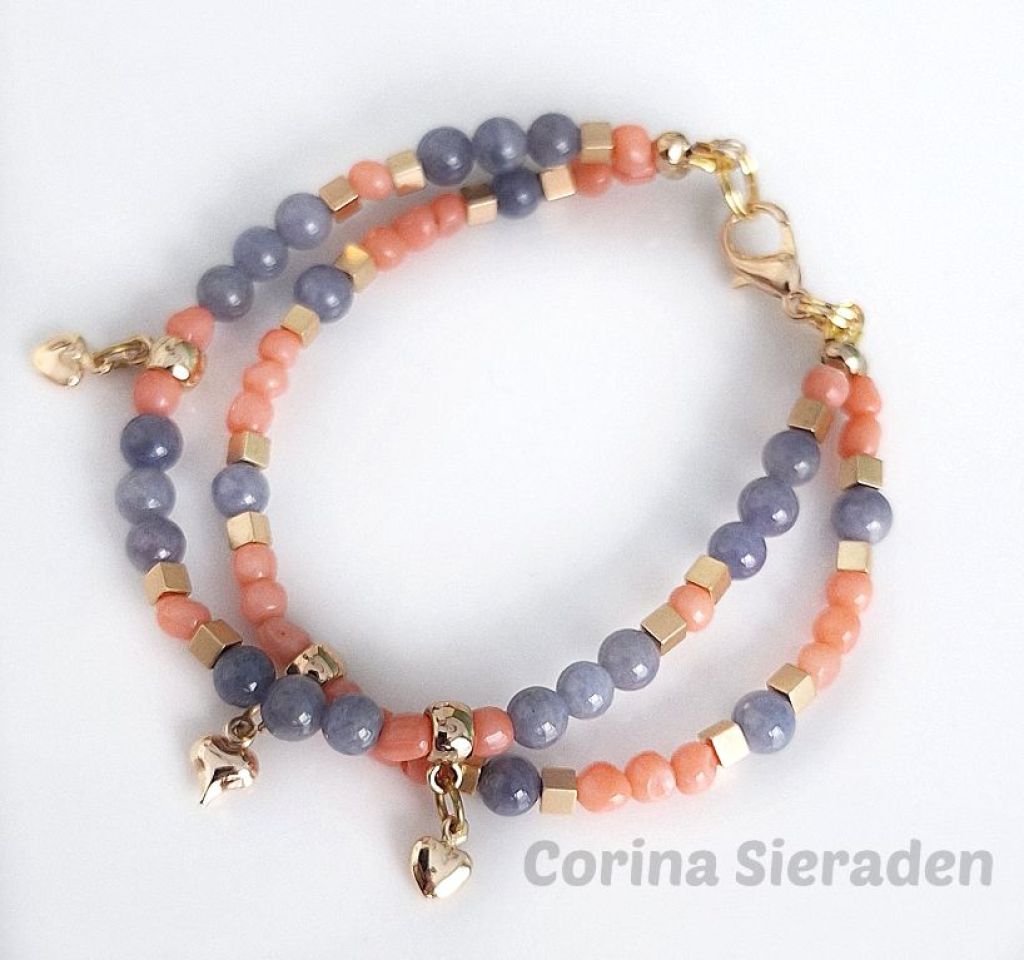 CORINA SIERADEN Dubbele armband van tanzaniet, gekweekte koraal en vergulde hematiet, met messing spacers.