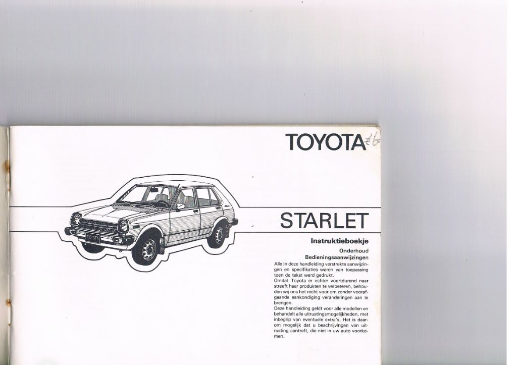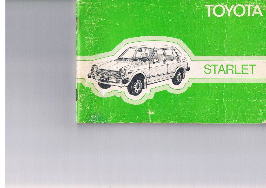 Toyota Starlet. Geniet boekje met kreukels op voorkaft en achterkaft. 82 pagina's. Jaartal niet vermeld, maar geschat jaren '70/'80. Prijs € 10,--. Verzending € 4,35.