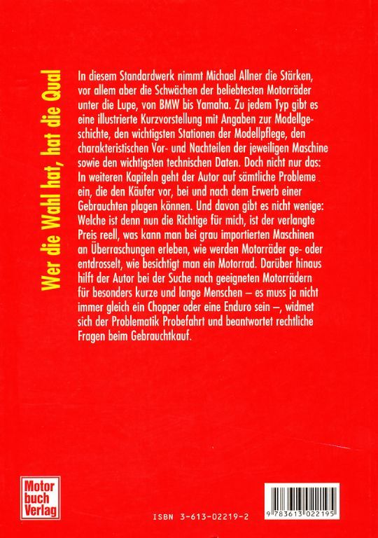 Und davon gibt es nicht wenige: Welche ist denn nun die Richtige für mich, ist der verlangte Preis reell, was kann man bei grau importierten Maschinen an Überraschungen erleben, wie werden Motorräder ge- oder entdrosselt, wie besichtigt man ein Motorrad; geeigneter Motorräder für besonders kurze und lange Menschen - es muss ja nicht immer gleich ein Chopper oder eine Enduro sein -, Problematik Probefahrt, (rechtliche) Fragen beim Gebrauchtkauf - nichts bleibt unbeantwortet.