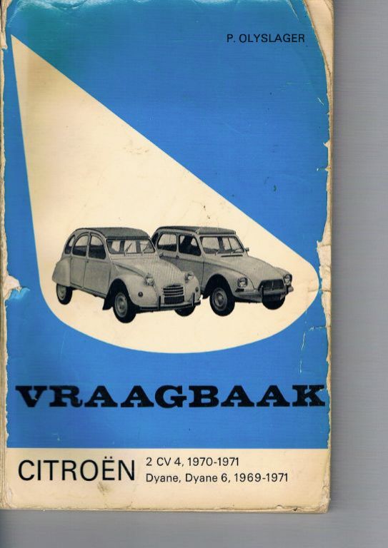 2 CV 4, 1971-1971, Dyane, Dyane 6, 1969-1971. Door P. Olyslager. Uitg. Kluwer. 1971. Achterin 4 losbladige schema's en overzichten. Het boekje is stevig gebruikt. Voor- en achterkaft liggen voor driekwart los. Achterkaft heeft een grote horizontale kreuk. Voorkaft heeft wat kreukjes, scheurtjes en mist hier en daar een stukje papier. De sneden hebben lichte vuilsporen. Het binnenwerk is in vrij goede staat. Kortom: geen mooi collectors item, maar een boek met de nodige informatie voor de gebruiker. 96 pagina's. Dikte 1 cm. Gewicht 228 gram. Verzendkosten vanaf € 3,95. Prijs € 9,50.