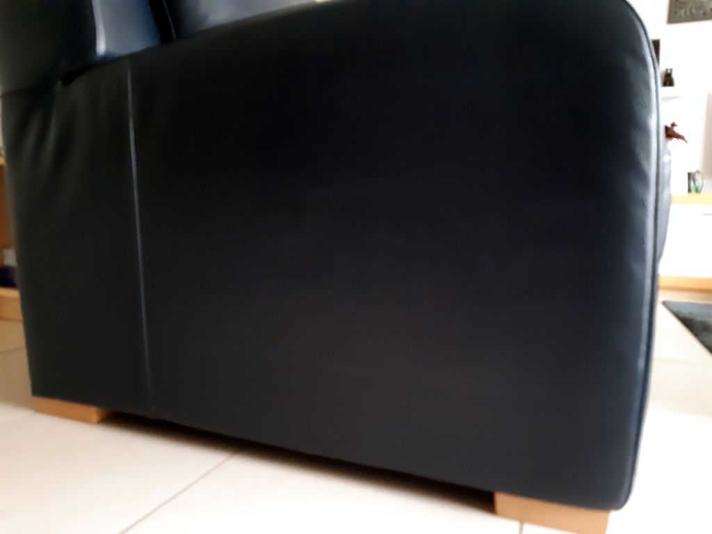 3-zits bank Natuzzi, donkerblauw met beukenhouten poten. Afm. 215 x 93 x 93
