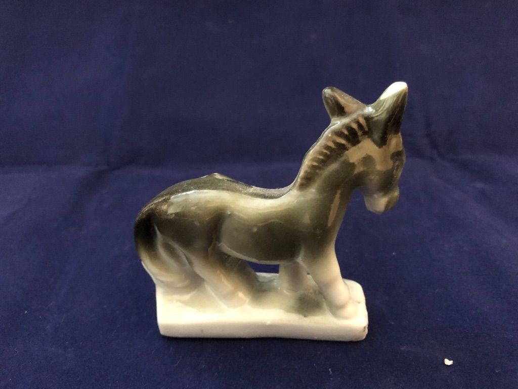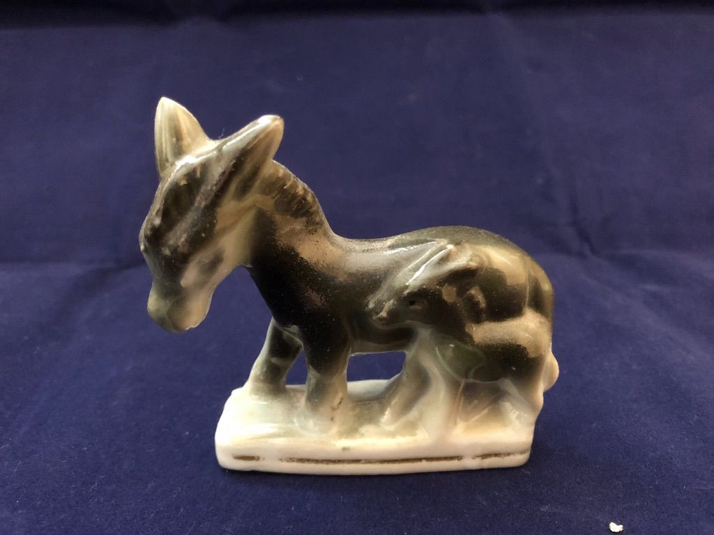 We verkopen een beeldje van een grijze ezel met jong.