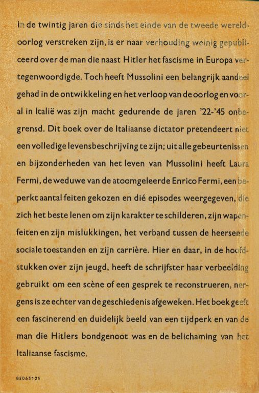 Dit boek over de Italiaanse dictator pretendeert niet een volledige levensbeschrijving te zijn; uit alle gebeurtenissen en bijzonderheden van het leven van Mussolini heeft Laura Fermi, de weduwe van de atoomgeleerde Enrico Fermi, een beperkt aantal feiten gekozen en die episodes weergegeven, die zich het beste lenen om zijn karakter te schilderen, zijn wapenfeiten en zijn mislukkingen, het verband tussen de heersende sociale toestanden en zijn carrière.