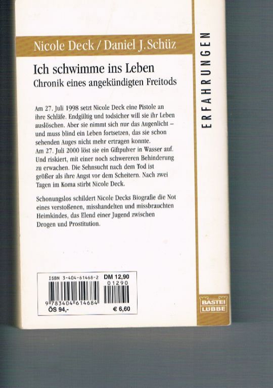 Uitg. Bastei Lübbe. 1999. Pocket 253 pagina's. Zo goed als nieuw. Dikte 2 cm. Gewicht 197 gram. Biografie van een vrouw, die het leven niet meer ziet zitten. Duits. Verzendkosten vanaf € 3,95. Prijs € 2,95.