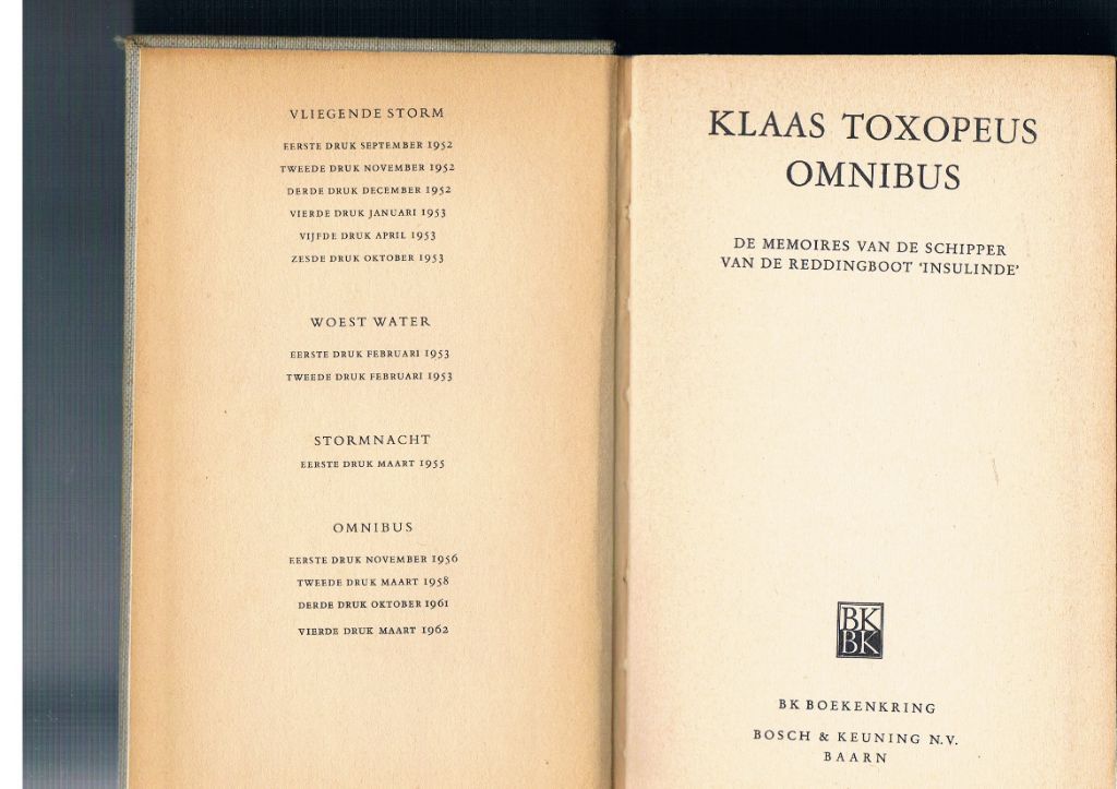 De memoires van de schipper van de reddingsboot “Insulinde”. Uitg. Bosch & Keuning. 6e druk 1962. Gebonden. 360 pagina's. Opgenomen de delen Vliegende Storm, Woest Water en Stormnacht. Wat lichte gebruikssporen: door het uit de kast trekken is het bovenste deel van de rug ca. 5 mm ingescheurd; op de achterzijde is een soort vlek waarneembaar. Verder in zeer goede staat. U kunt dit reeds lang uitverkochte boek in Uw bezit krijgen voor slechts € 6,95.