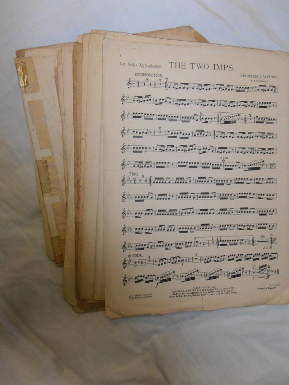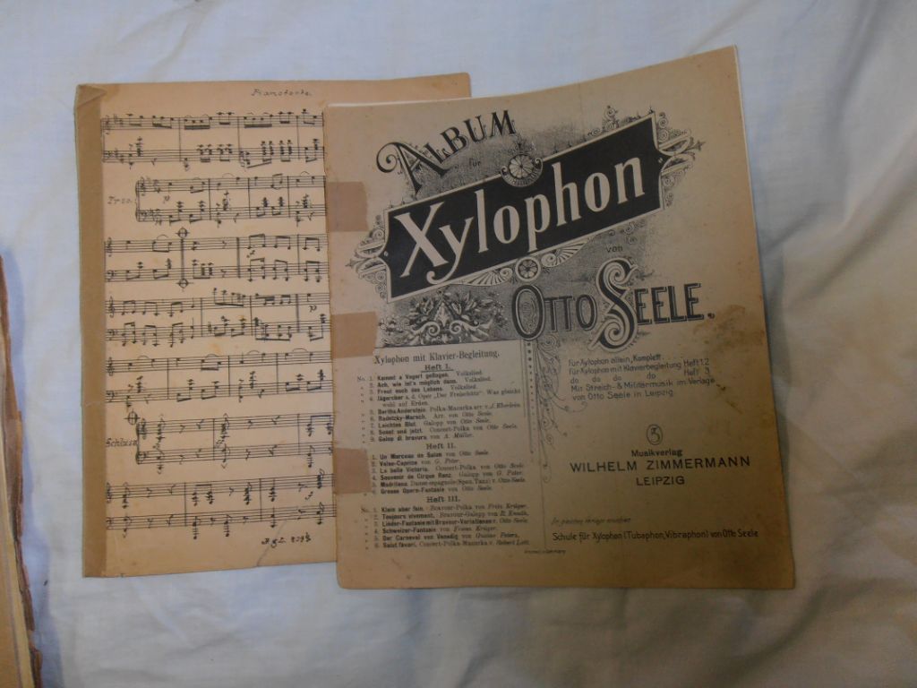 Partijtje muziekboekjes en bladen voor xylofoon. Ca. 16 stuks. Boekjes en bladen in diverse staten. Ook extra 3 studieboekjes, die er kennelijk mee te maken hebben.Voor € 16,-- mag U het zelf uitzoeken. Verzendkosten vanaf € 4,50. M.i. populair en klassiek door elkaar.