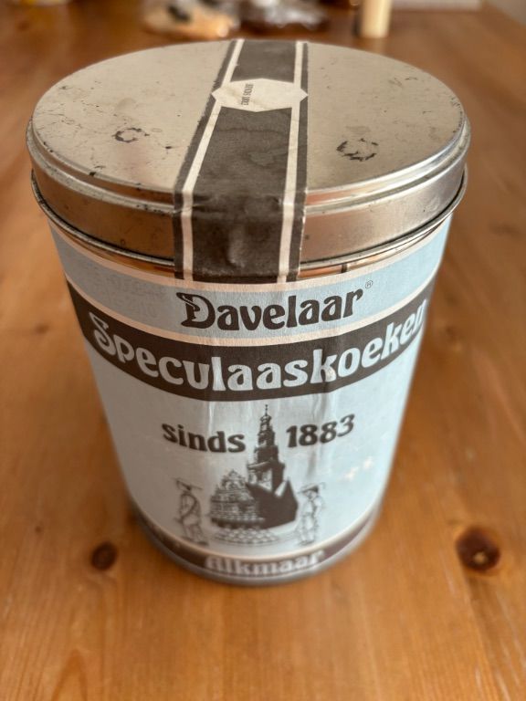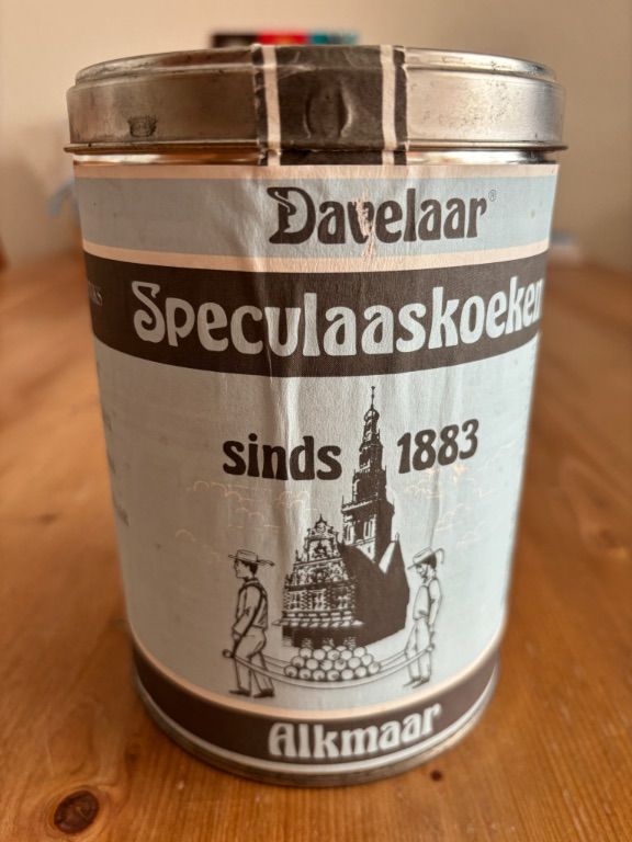 Davelaar speculaaskoeken oud blik papier bus