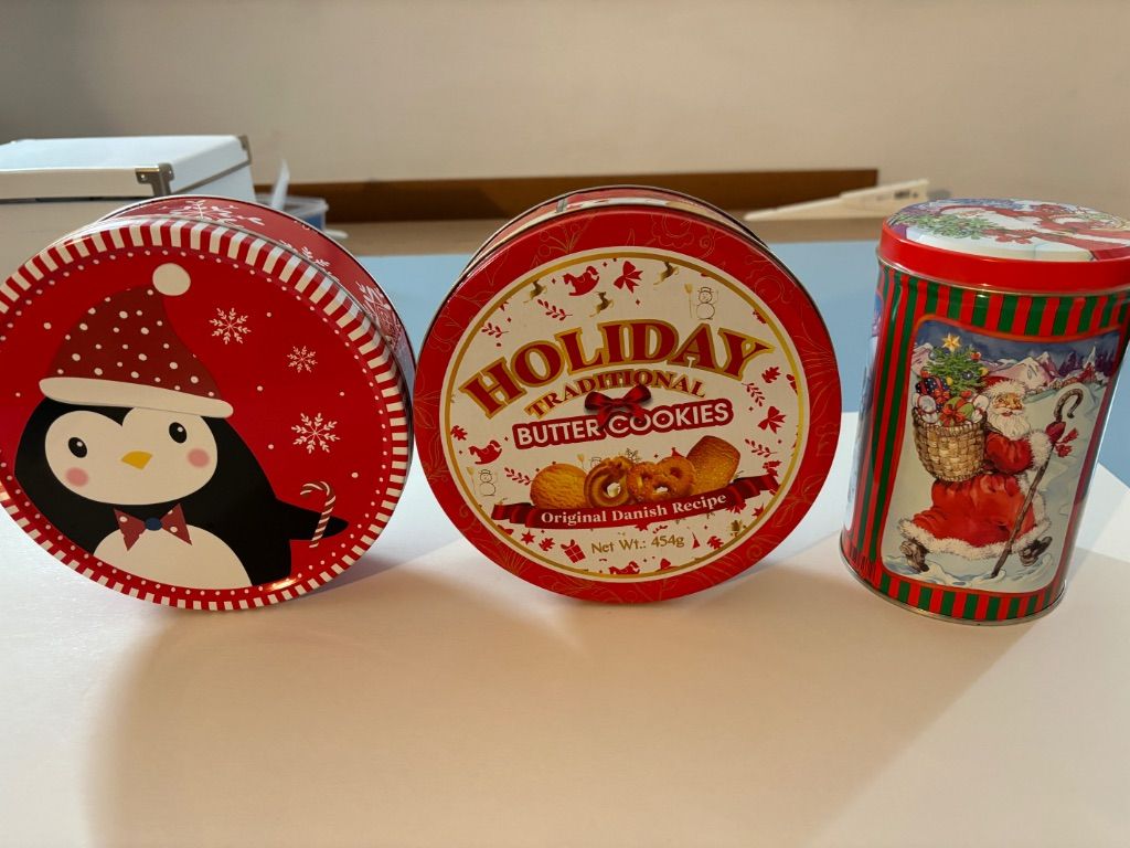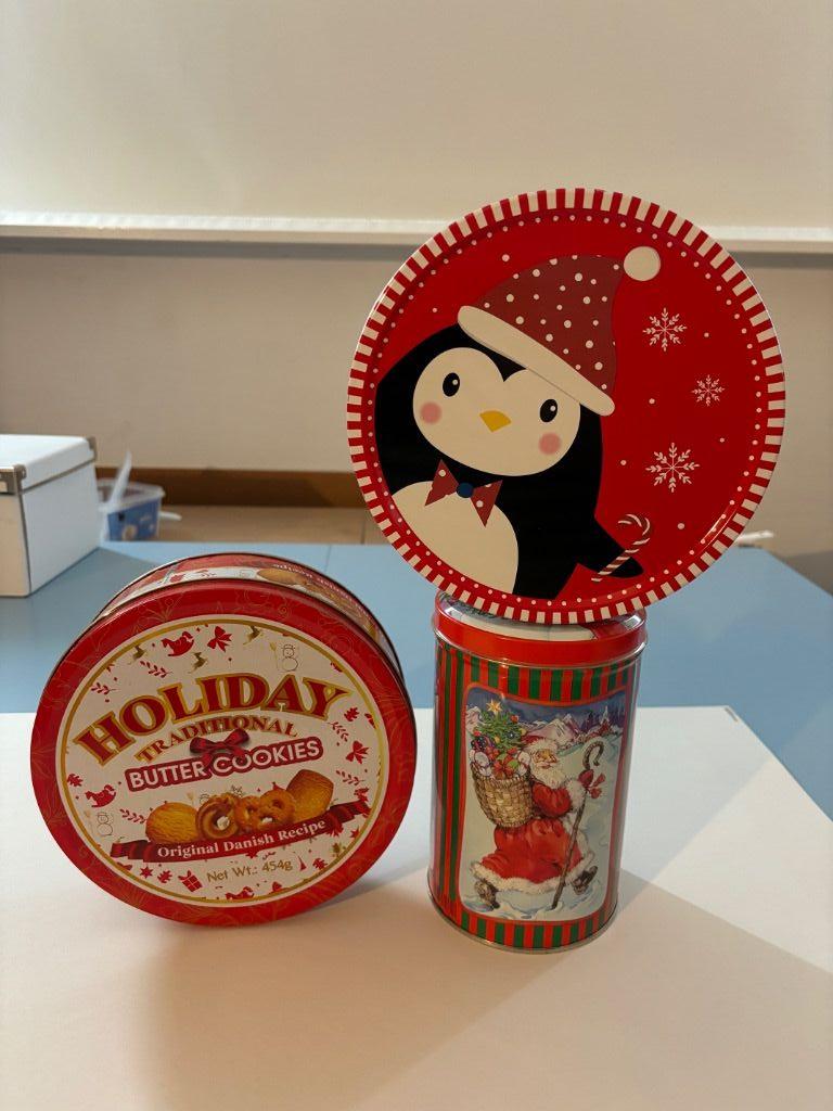 Wij verkopen 3 verschillende kerst likken en lege koektrommels.